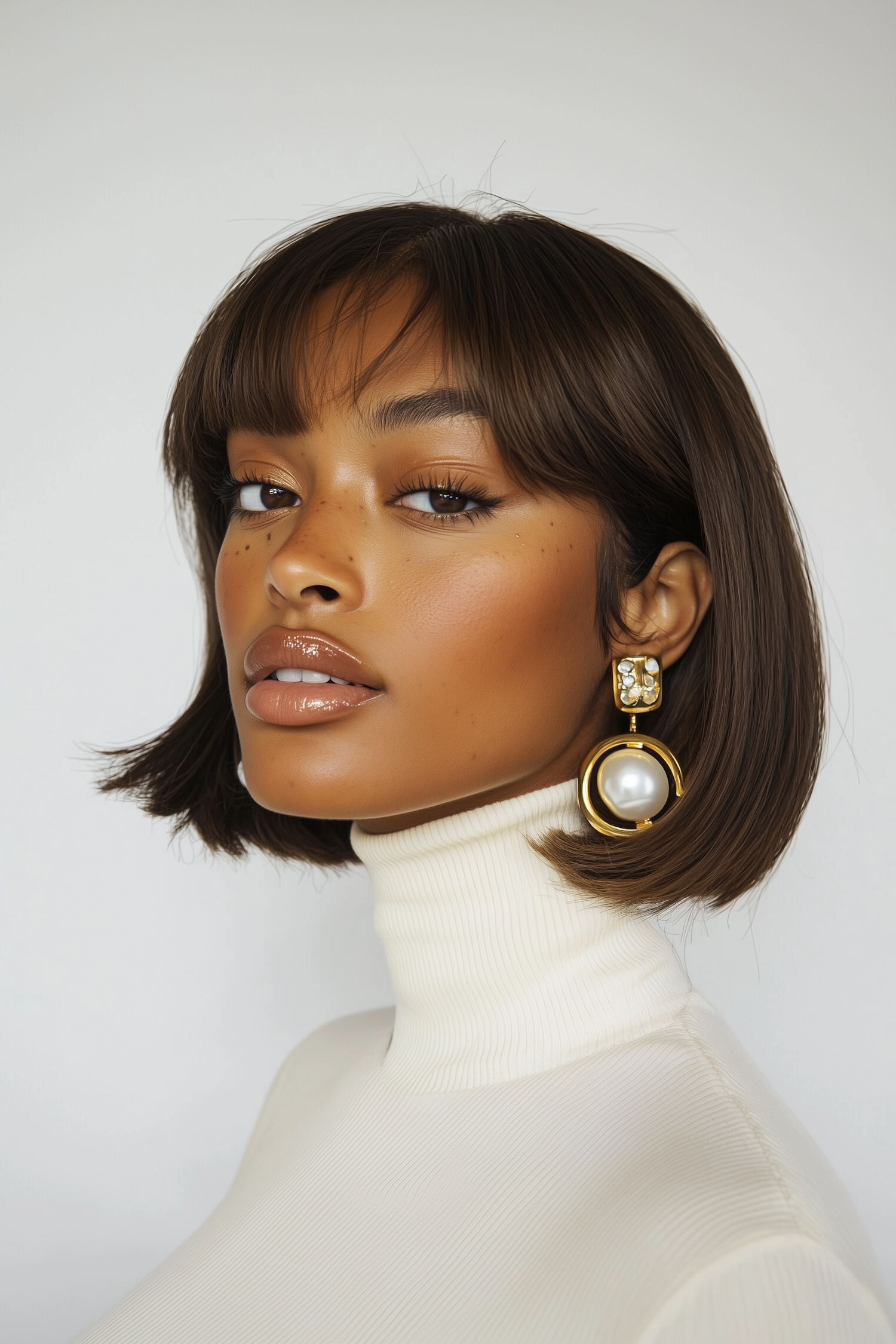 Elegant woman with glossy lips, gold-pearl earrings, and a white turtleneck. Her confident gaze and chic bob hairstyle stand out.