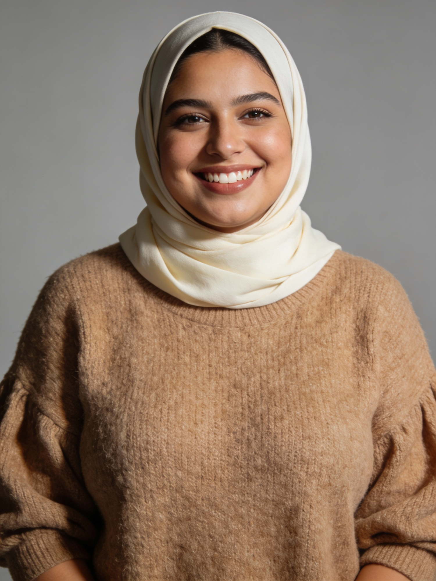 Studio portrait of a Jordanian female in her early 30s; plus-size body; medium olive skin, warm undertone; soft cream hijab wrapped neatly; chunky light brown knit sweater with a relaxed fit, no logos; neutral mid-gray seamless backdrop; Rembrandt lighting with soft fill; 105 mm macro-sharp. Expression: warm and confident, bright smile showing teeth. Framing: portrait orientation, 3:4 ratio; mid-chest-up composition. Subject centered in frame, camera at eye level, facing directly toward the camera (front view). Full hijab and head completely inside the frame with a little space above; both shoulders visible, no cropping at the top or sides. Neutral studio composition, no props.