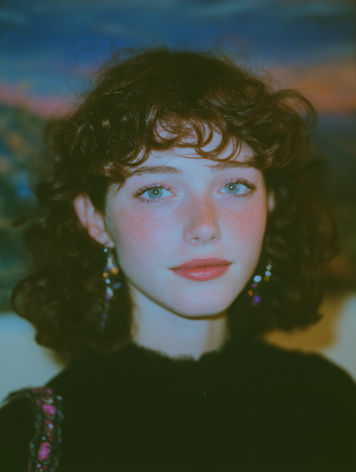 Portrait of a young woman with curly hair, green eyes, and freckles, wearing a black top and earrings, set against a blurred colorful background.
