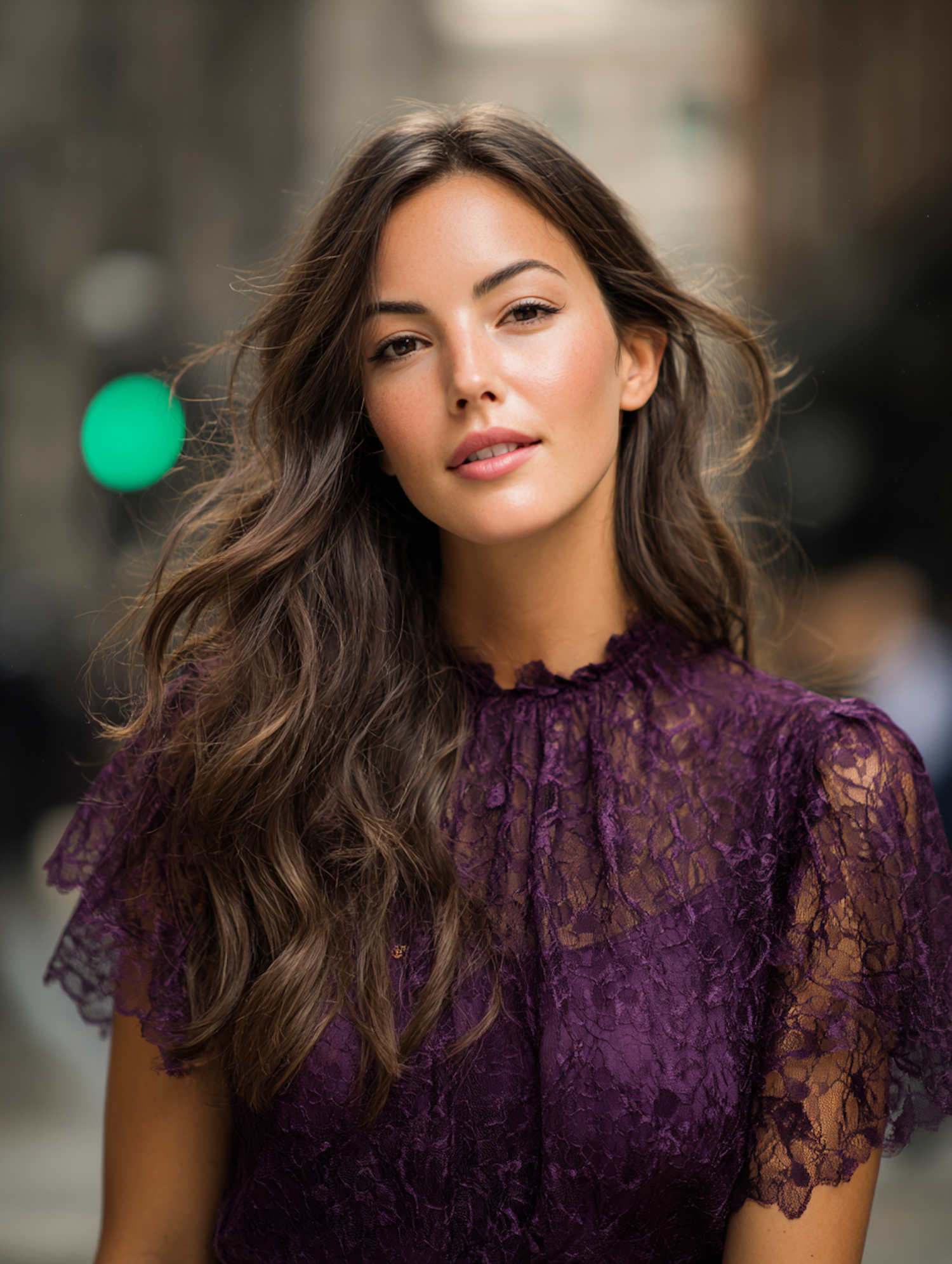 Close-up of a woman with wavy brown hair in a purple lace top, set against a softly blurred urban background with warm lighting.