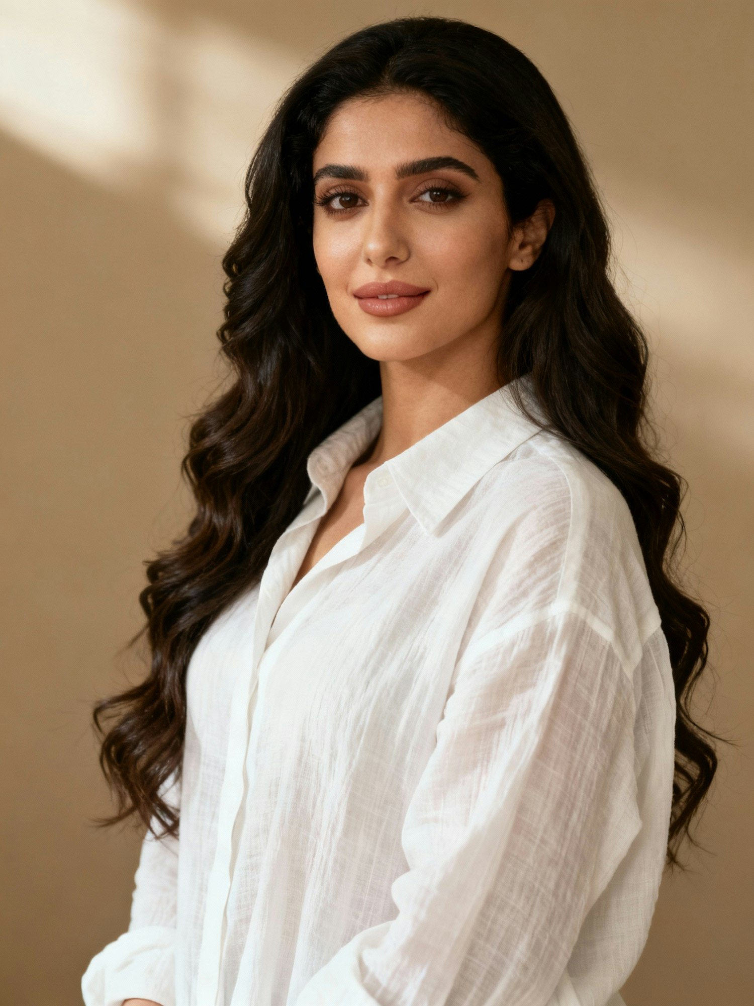 A woman with long dark hair and a white shirt poses against a softly lit neutral background, exuding a calm and confident demeanor.