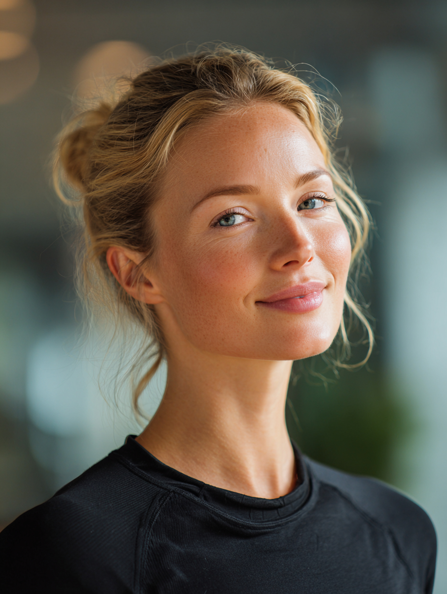 Close-up portrait of a young woman with blonde hair in a bun, wearing a black top, smiling softly against a blurred background.
