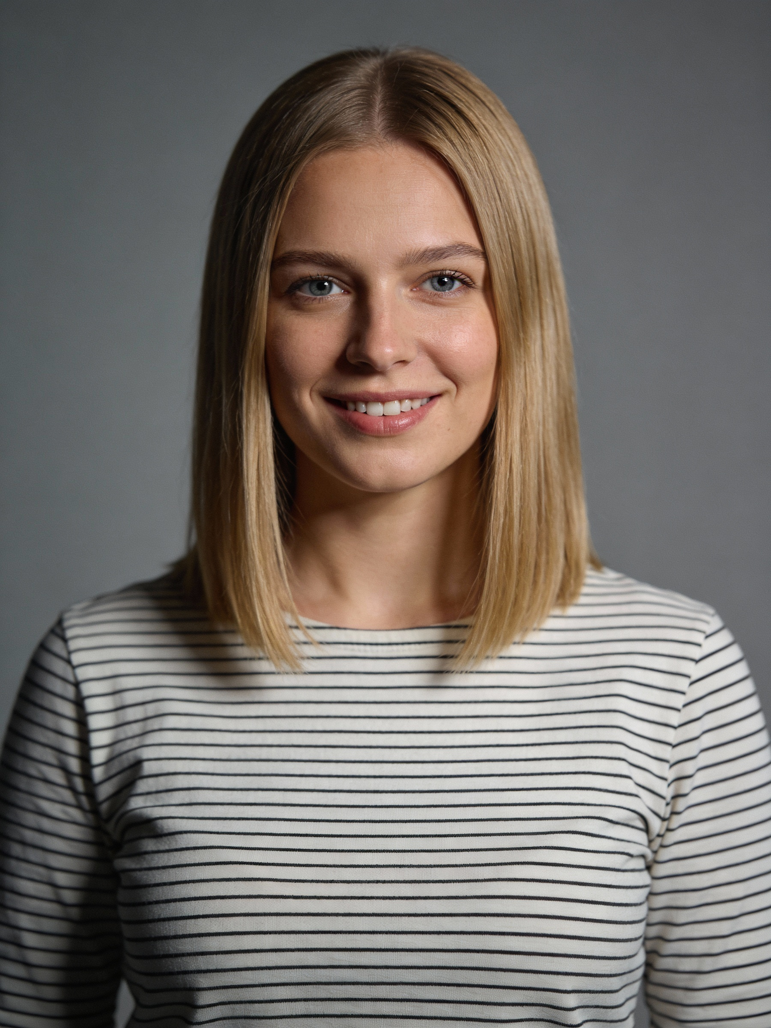 A young woman with blonde hair and a striped shirt smiles warmly against a neutral gray background.