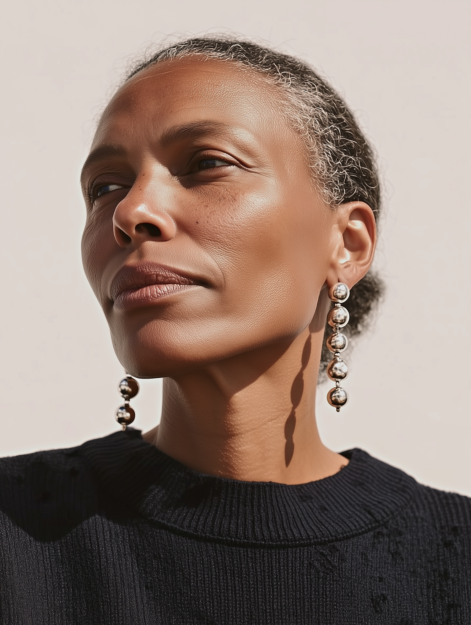 Close-up of a woman with graying hair, wearing a navy sweater and metallic earrings, against a light background.