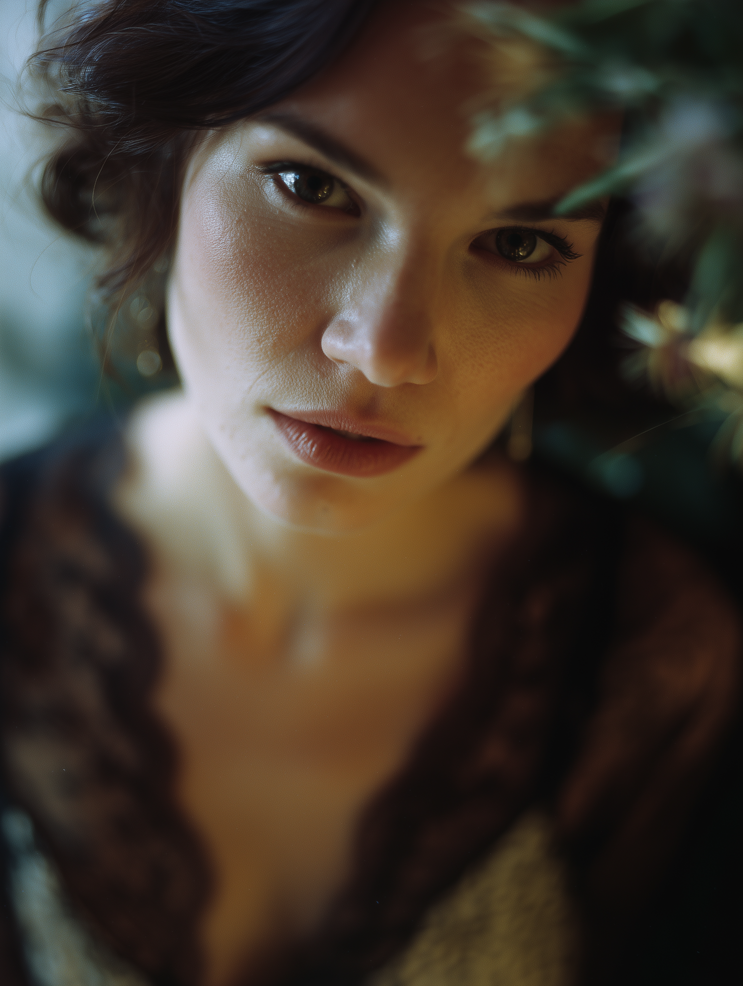 Close-up portrait of a woman with dark hair and lace-trimmed attire, gazing directly at the camera with a soft, blurred background.