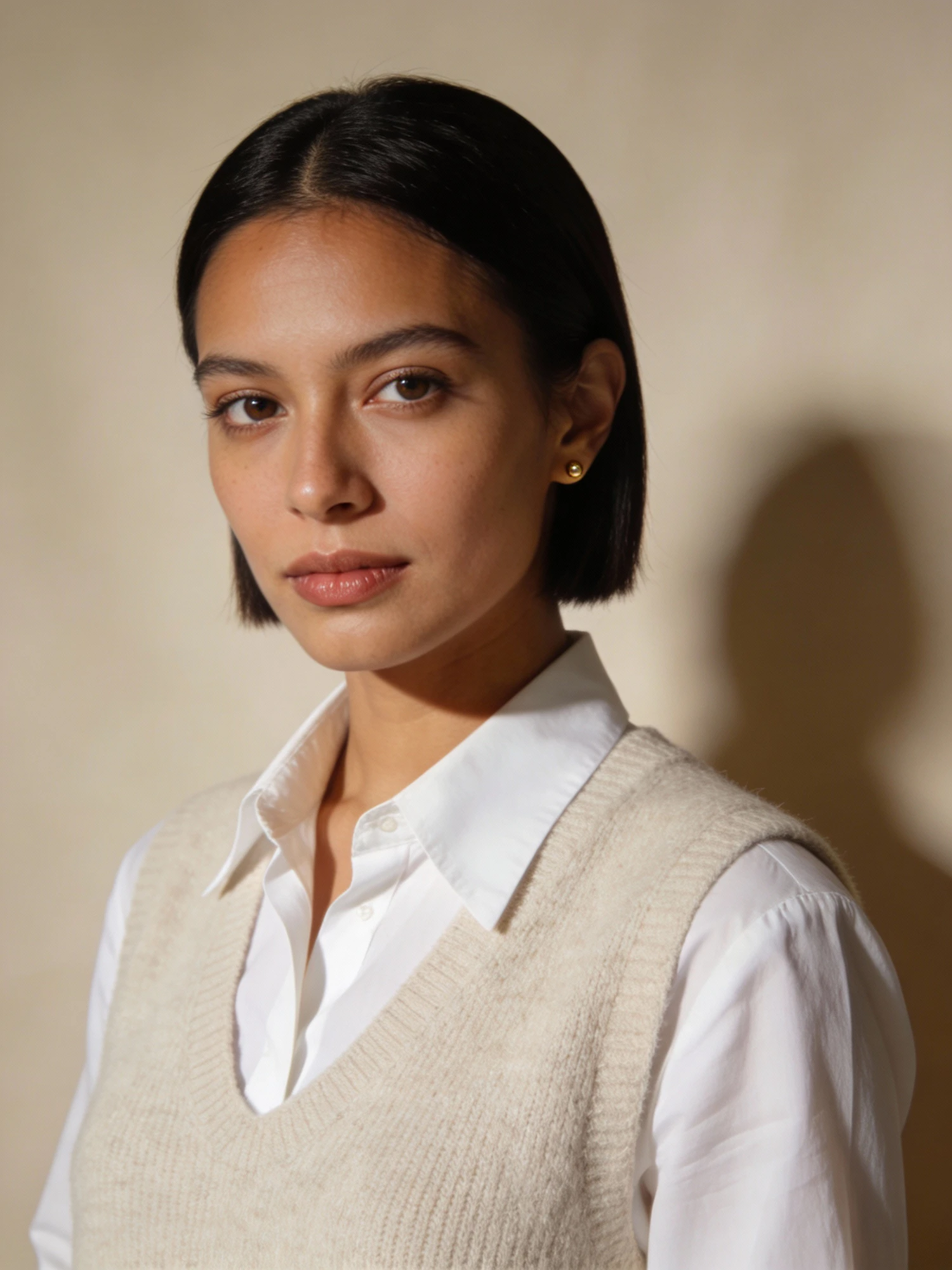 Studio portrait, Scandi-minimal fashion editorial, female early 30s; medium tan skin, warm-neutral undertone; straight bob tucked behind ears. Outfit: crisp white poplin shirt (clean collar visible) under a light beige knit vest, no logos; tiny gold studs. Solid cool-beige seamless backdrop; Rembrandt lighting with soft fill; 105 mm macro-sharp. Expression: serene, confident, eyes to camera.