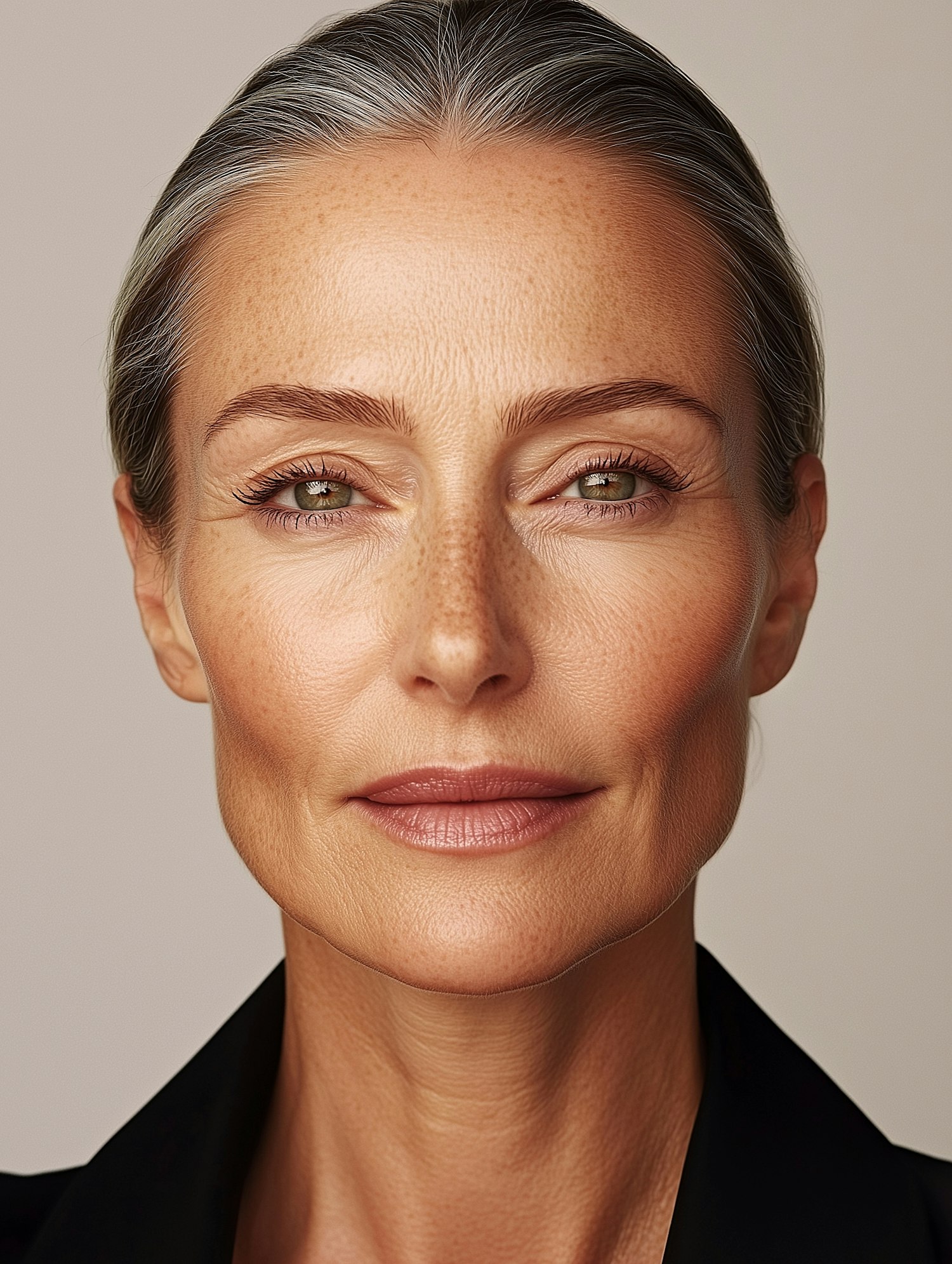Portrait of a middle-aged woman with gray hair and green eyes, showcasing natural beauty and serene expression against a neutral background.
