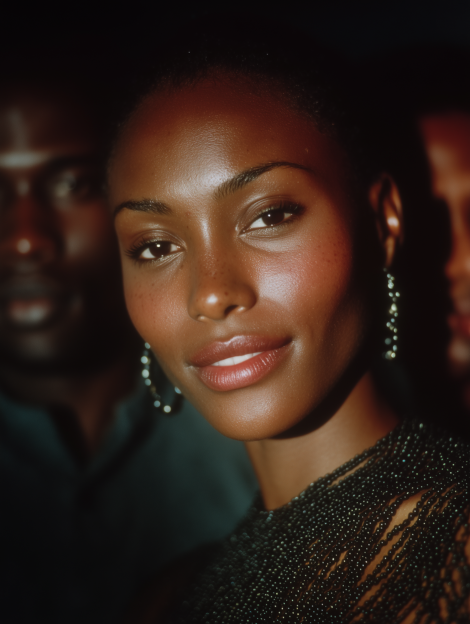 Close-up of a woman with glowing skin, wearing a beaded outfit and earrings, in a dimly lit setting with blurred figures in the background.