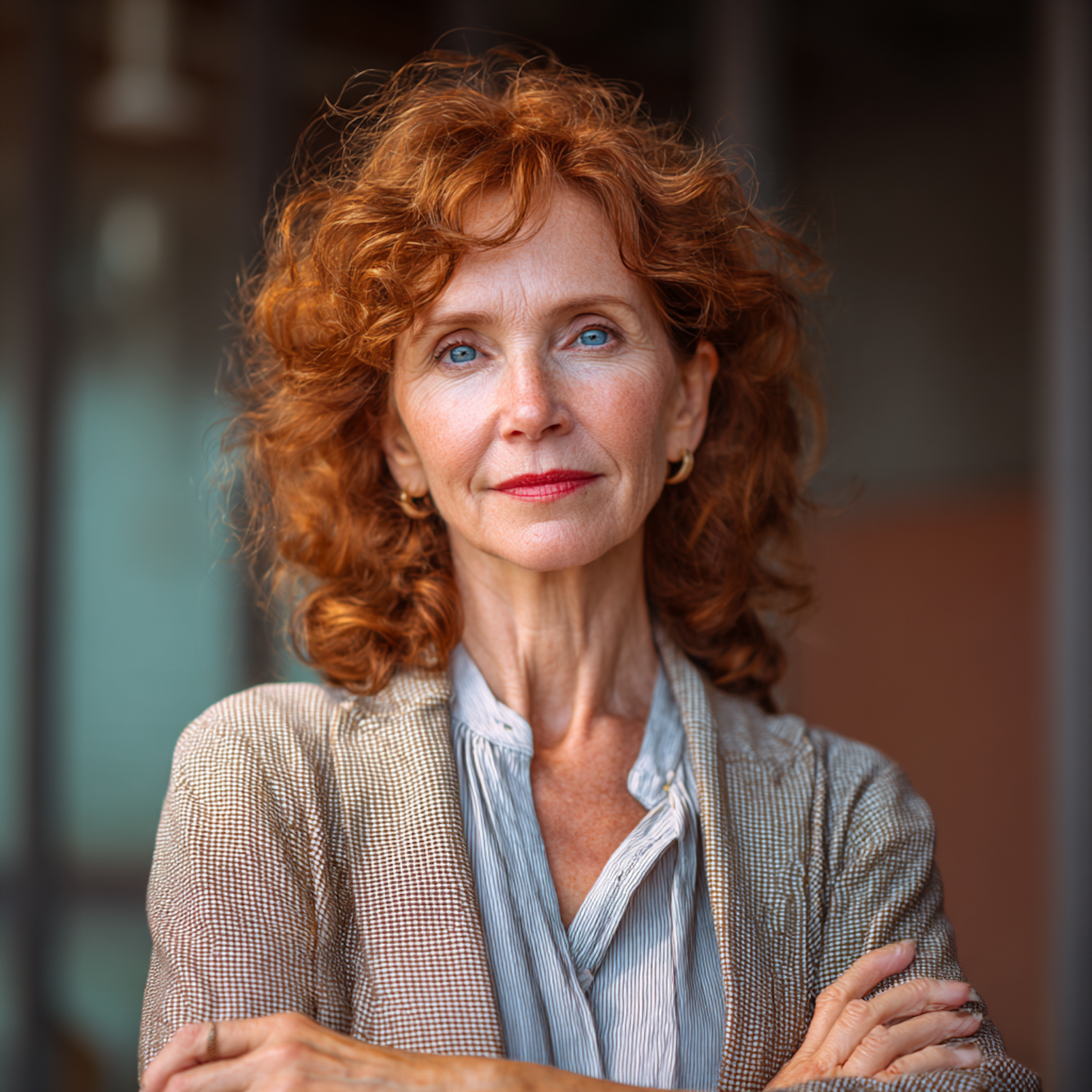 Portrait of a woman with red curly hair and blue eyes, wearing a blazer and striped shirt, standing confidently with a blurred background.