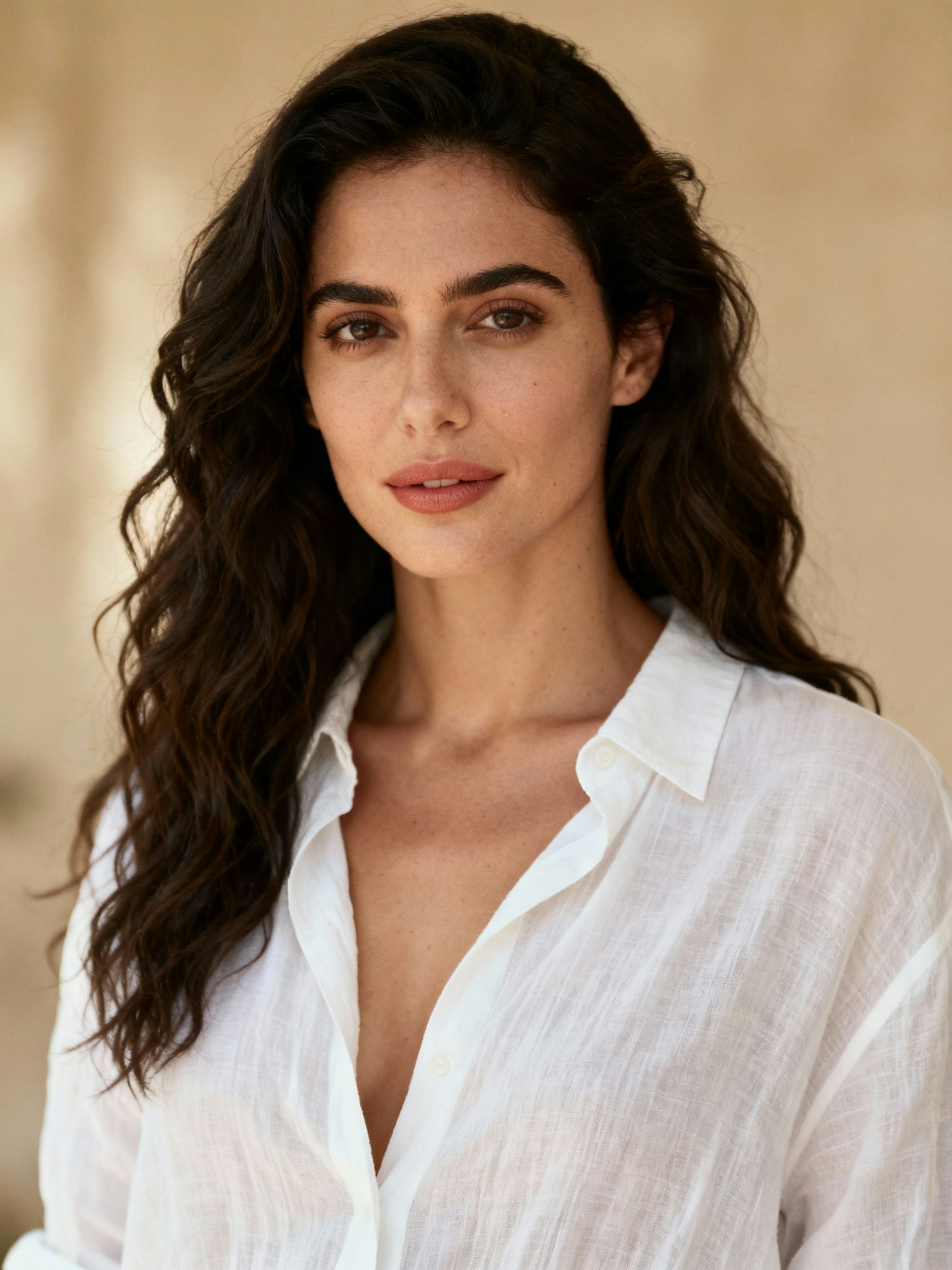Cinematic portrait of a greek woman, 26; long wavy hair; white linen shirt. Background: plain beige, defocused.
