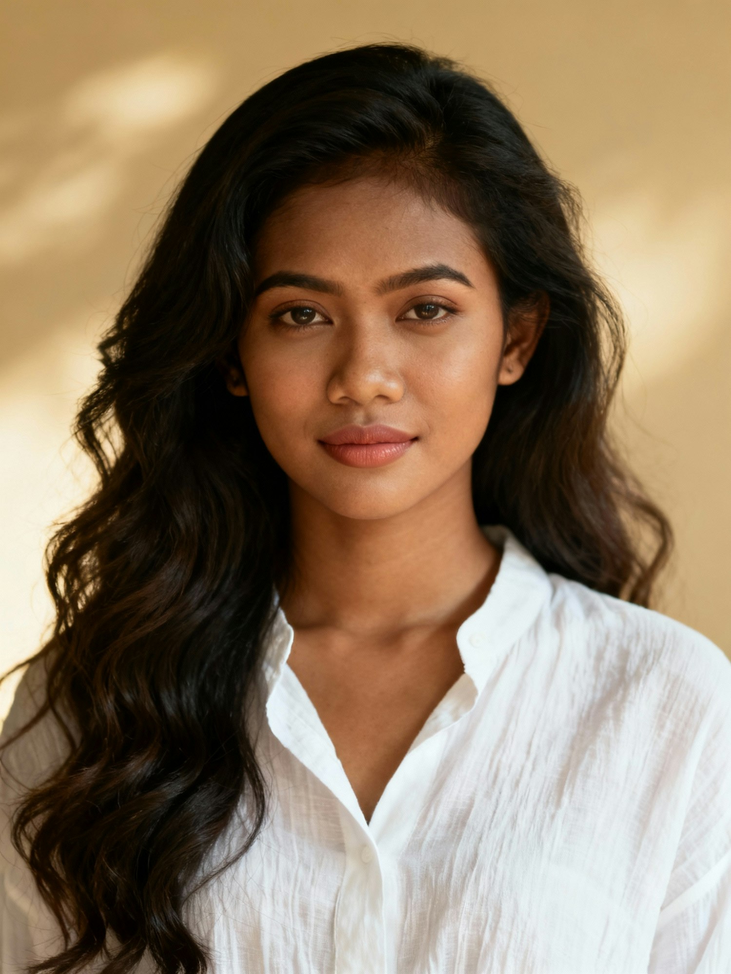 A woman with long, wavy black hair and a white shirt, captured in soft lighting against a neutral background.