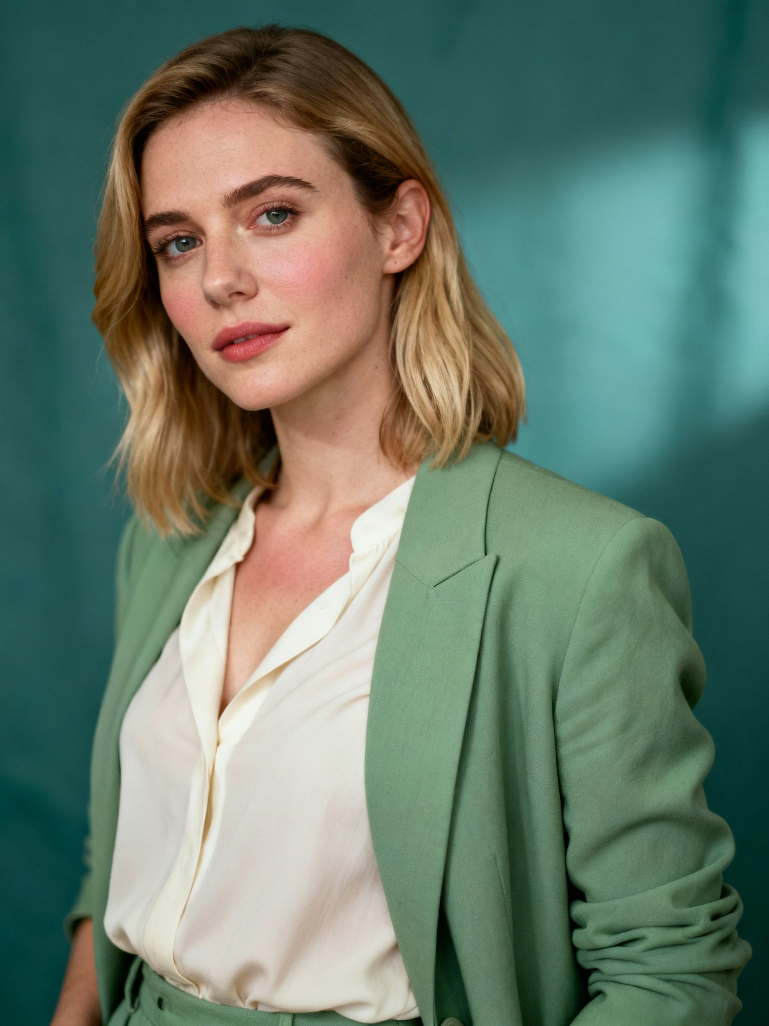 Cinematic studio portrait of a Croatian woman, 27; fair skin, rosy; mid-length blonde hair; soft-green blazer over ivory blouse. Backdrop: muted teal seamless, shallow DOF blur. Angle: waist-up, slight lean toward camera. Lighting: diffused key, gentle bounce; no backlight. Camera: 105 mm, f/2.8. Skin: smooth tonal transitions, filmic grade. Negative: over-saturation, HDR, watermarks.