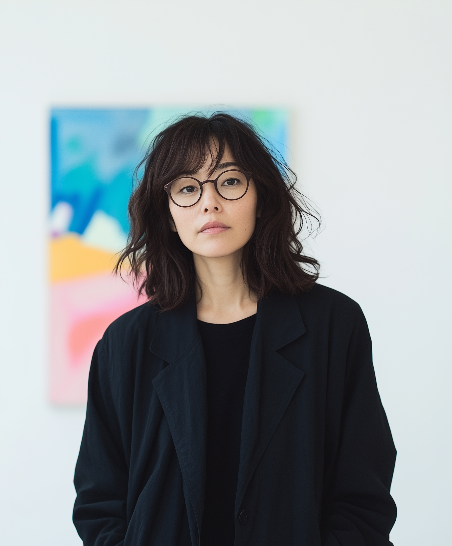 Asian woman with glasses in black attire stands in front of a colorful abstract painting, exuding a calm and composed demeanor.