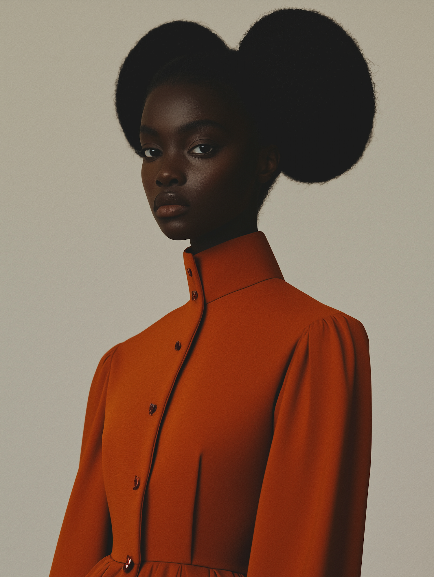 Elegant Black woman in burnt orange dress with unique afro puff hairstyle, exuding grace and strength against a neutral background.