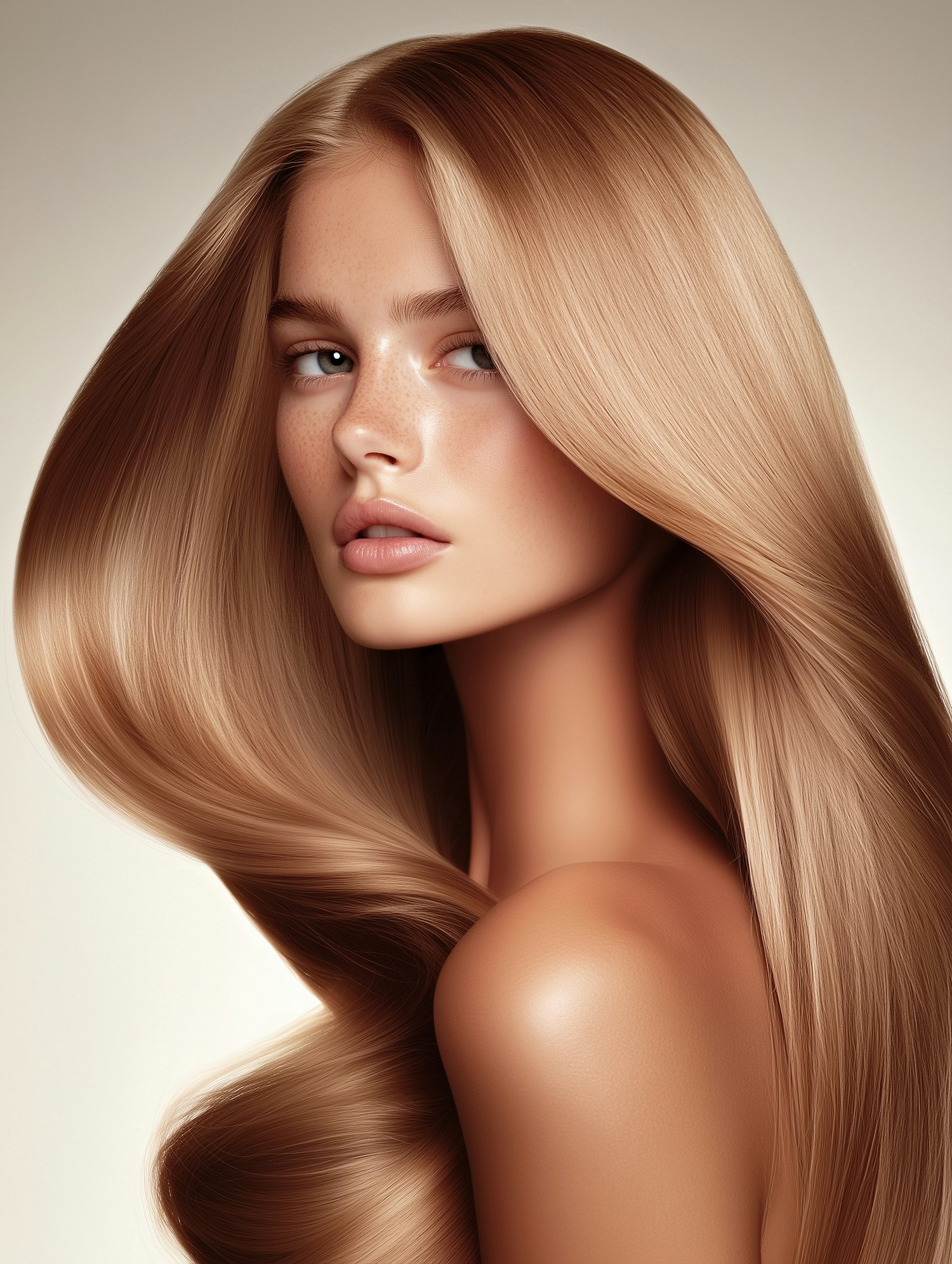 Portrait of a young woman with long, silky light brown hair and striking blue eyes, exuding elegance and natural beauty.