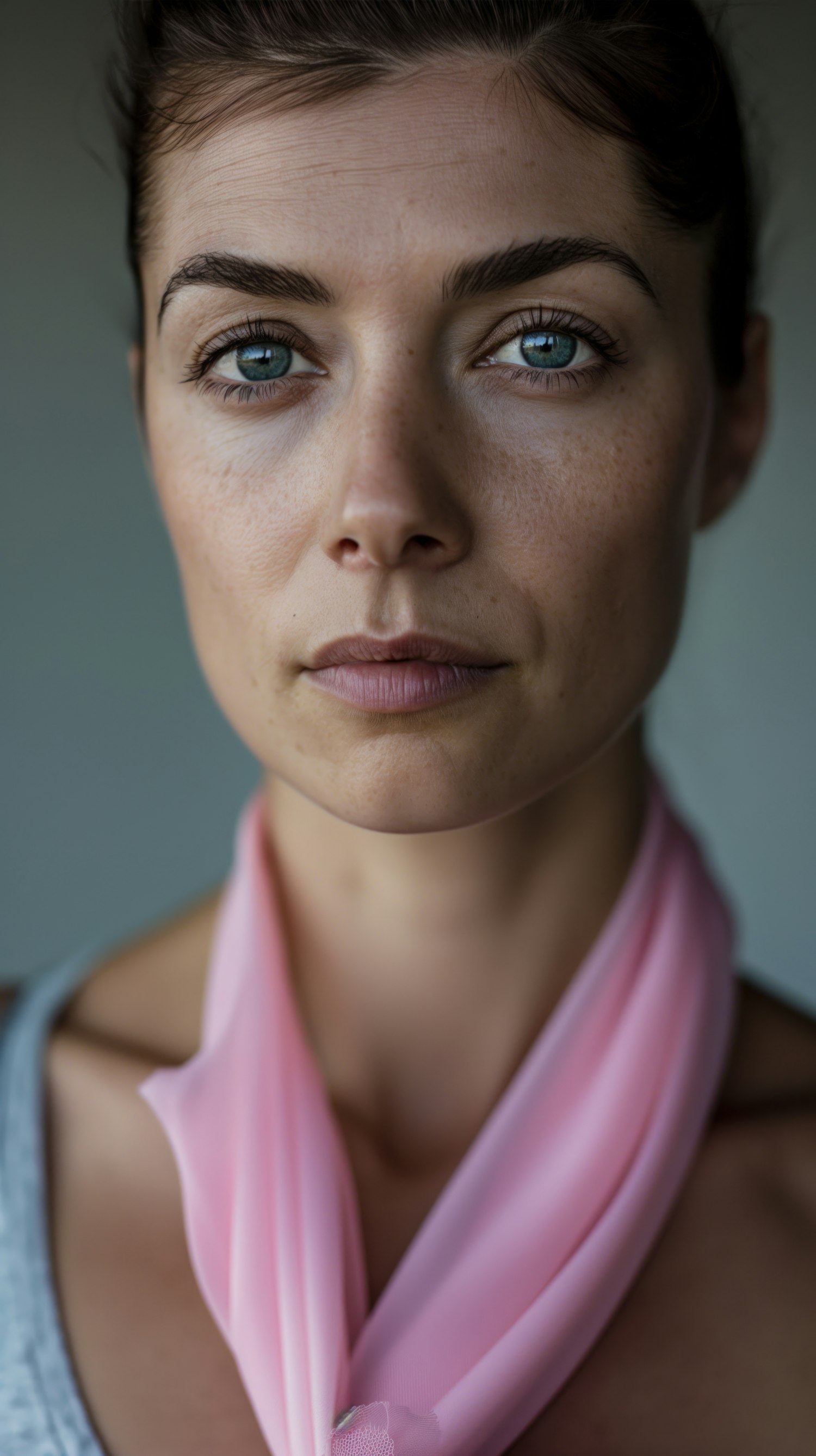 Close-up portrait of a woman with blue eyes and a pink scarf, showcasing her calm expression and natural beauty.