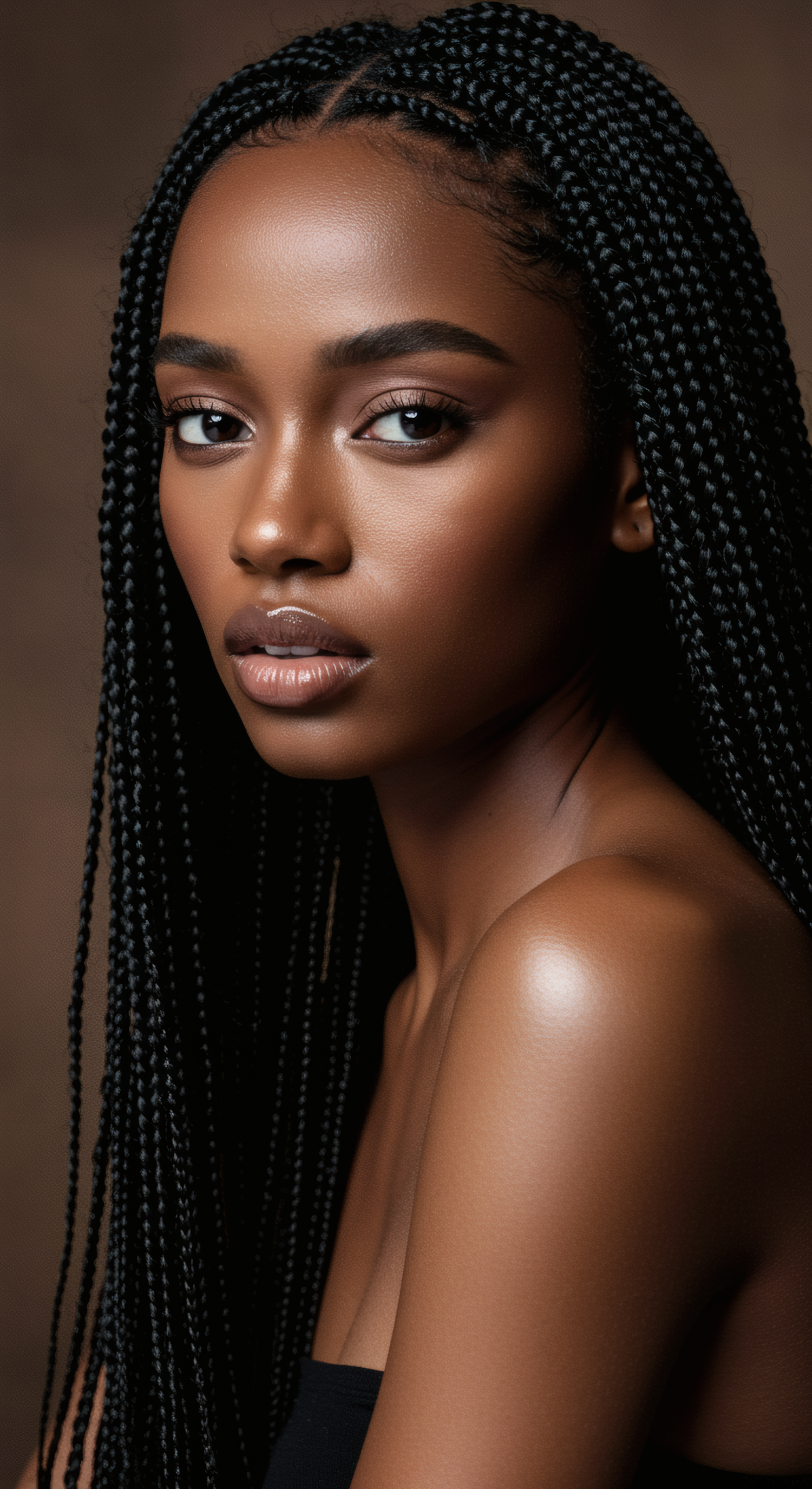 Portrait of a young Black woman with braided hair, glowing skin, and natural makeup, exuding confidence and elegance.
