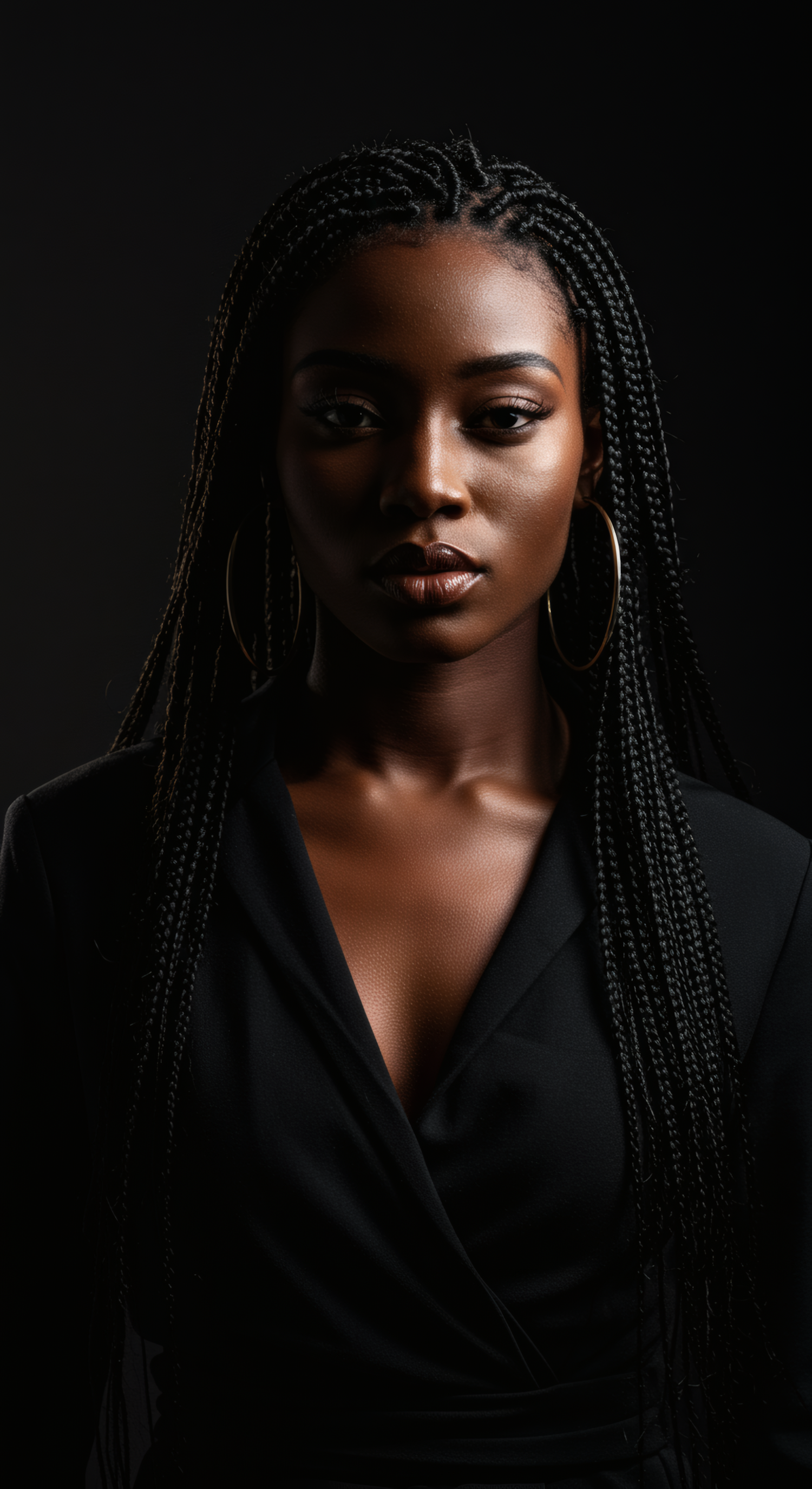 Portrait of a Black woman with braided hair and hoop earrings, wearing a black outfit against a dark background.