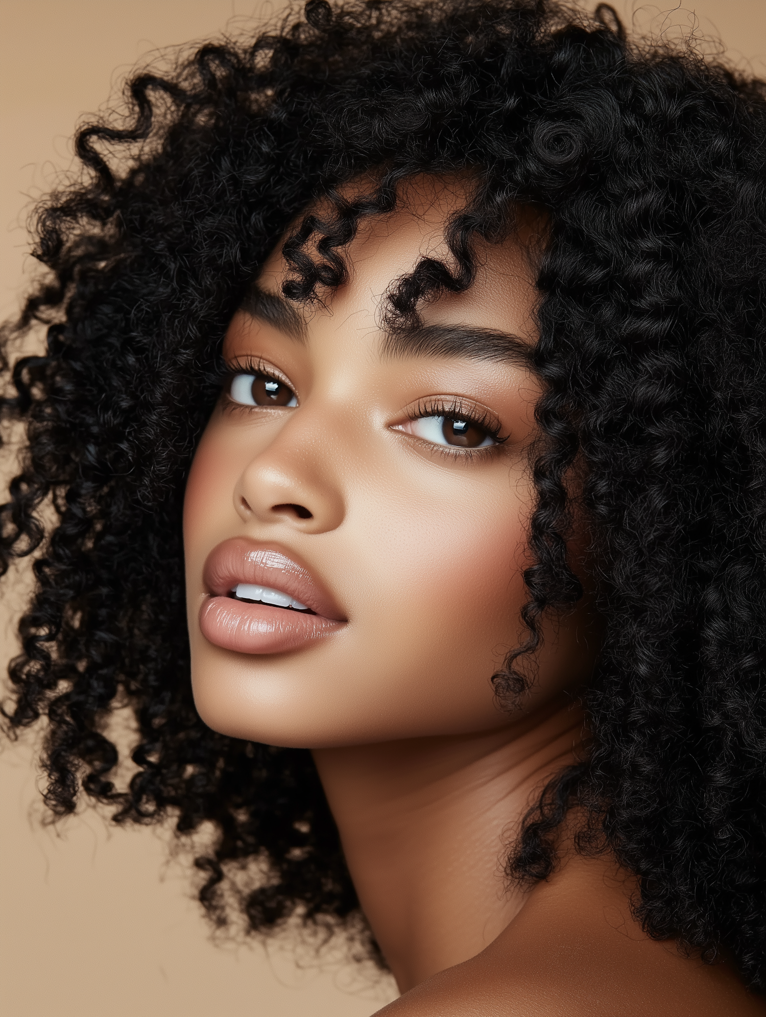 Portrait of a young Black woman with curly hair and glowing skin, exuding elegance and confidence against a soft beige background.