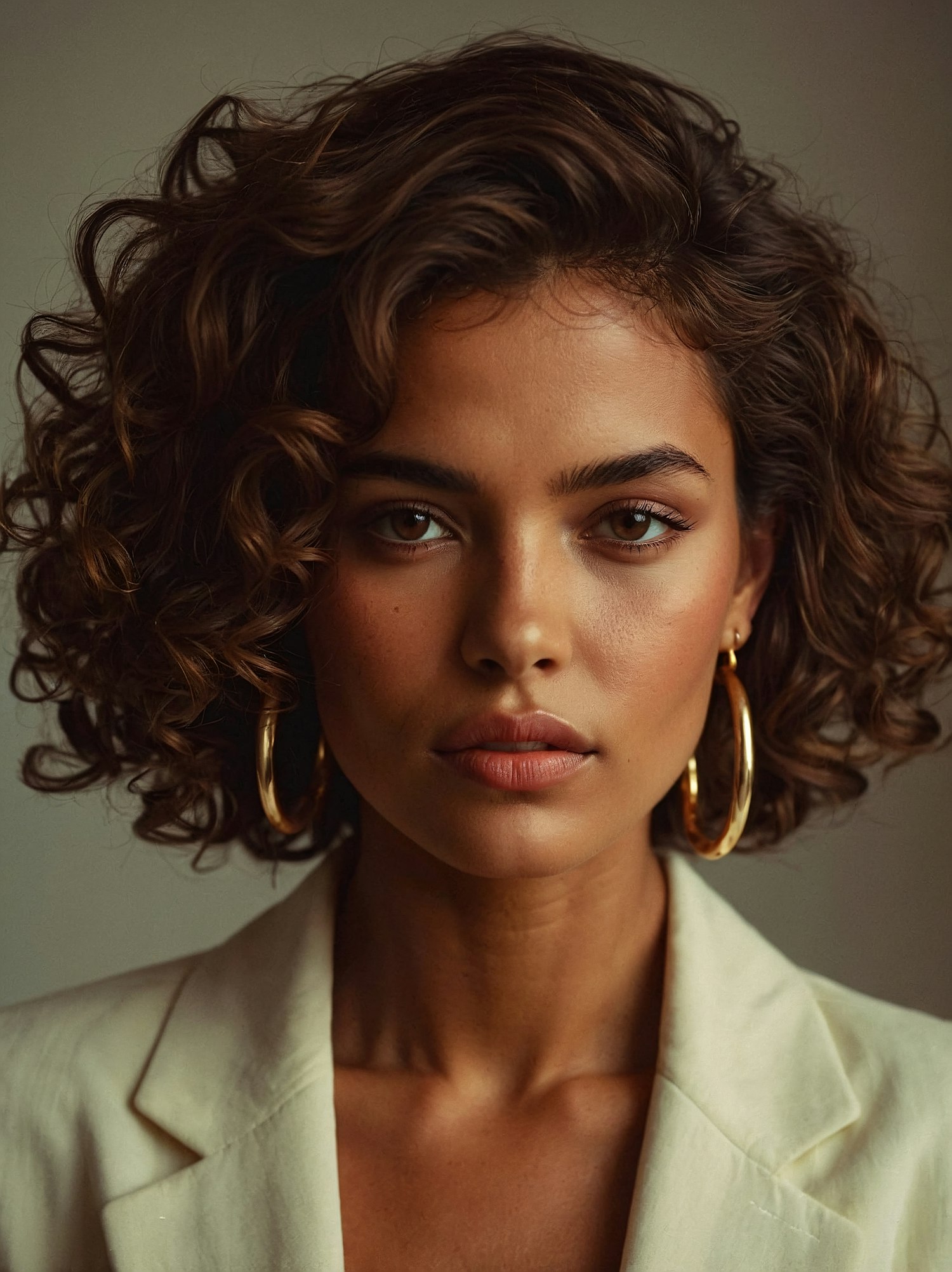 Portrait of a stylish woman with curly hair, gold hoop earrings, and a cream blazer, exuding elegance and confidence.