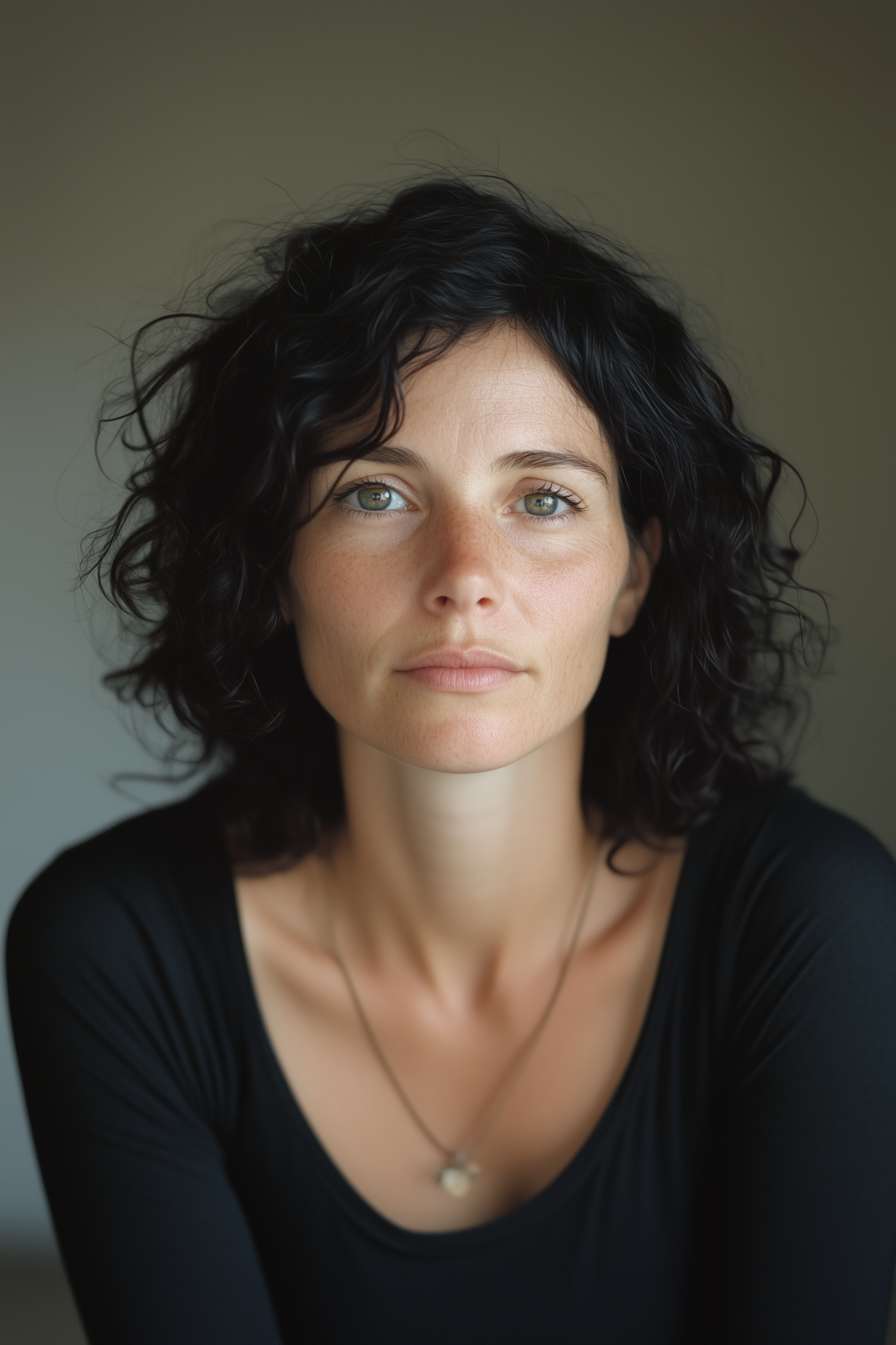 Portrait of a woman with curly black hair and green eyes, wearing a black top and necklace, against a neutral background.