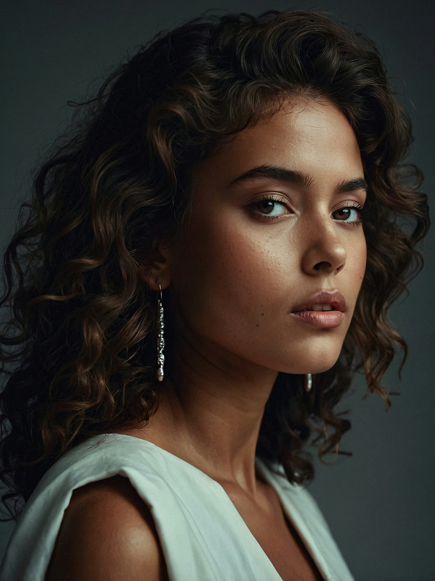 Elegant woman with curly dark hair and silver earrings in a white top, set against a muted gray background.