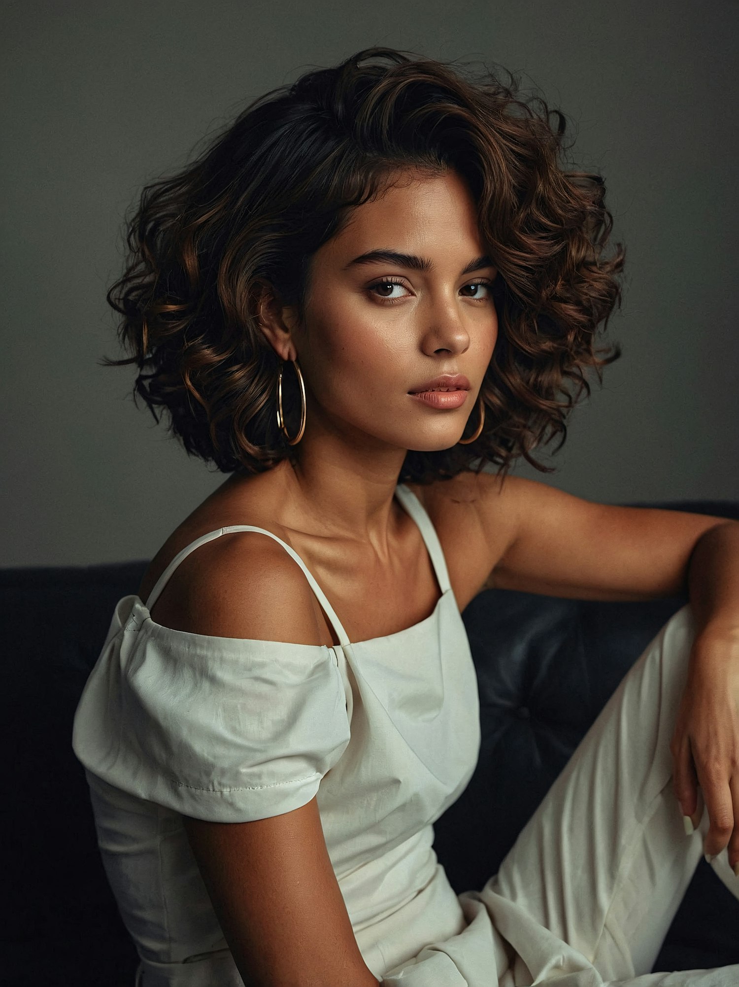 Confident woman with curly hair and hoop earrings in a light off-shoulder top, sitting on a dark couch.