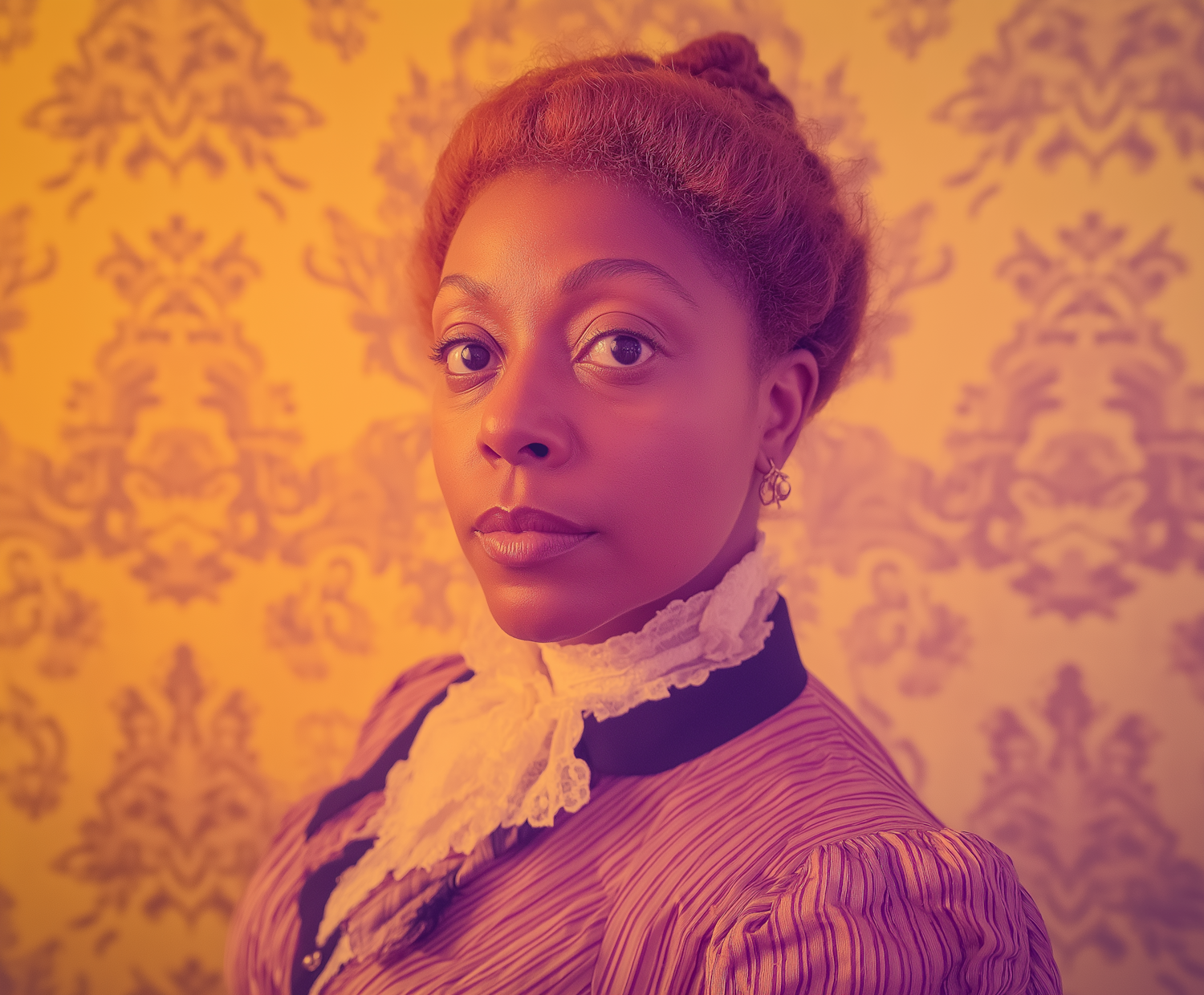 Elegant Black woman in vintage attire with lace collar, set against ornate wallpaper, bathed in warm, golden light.