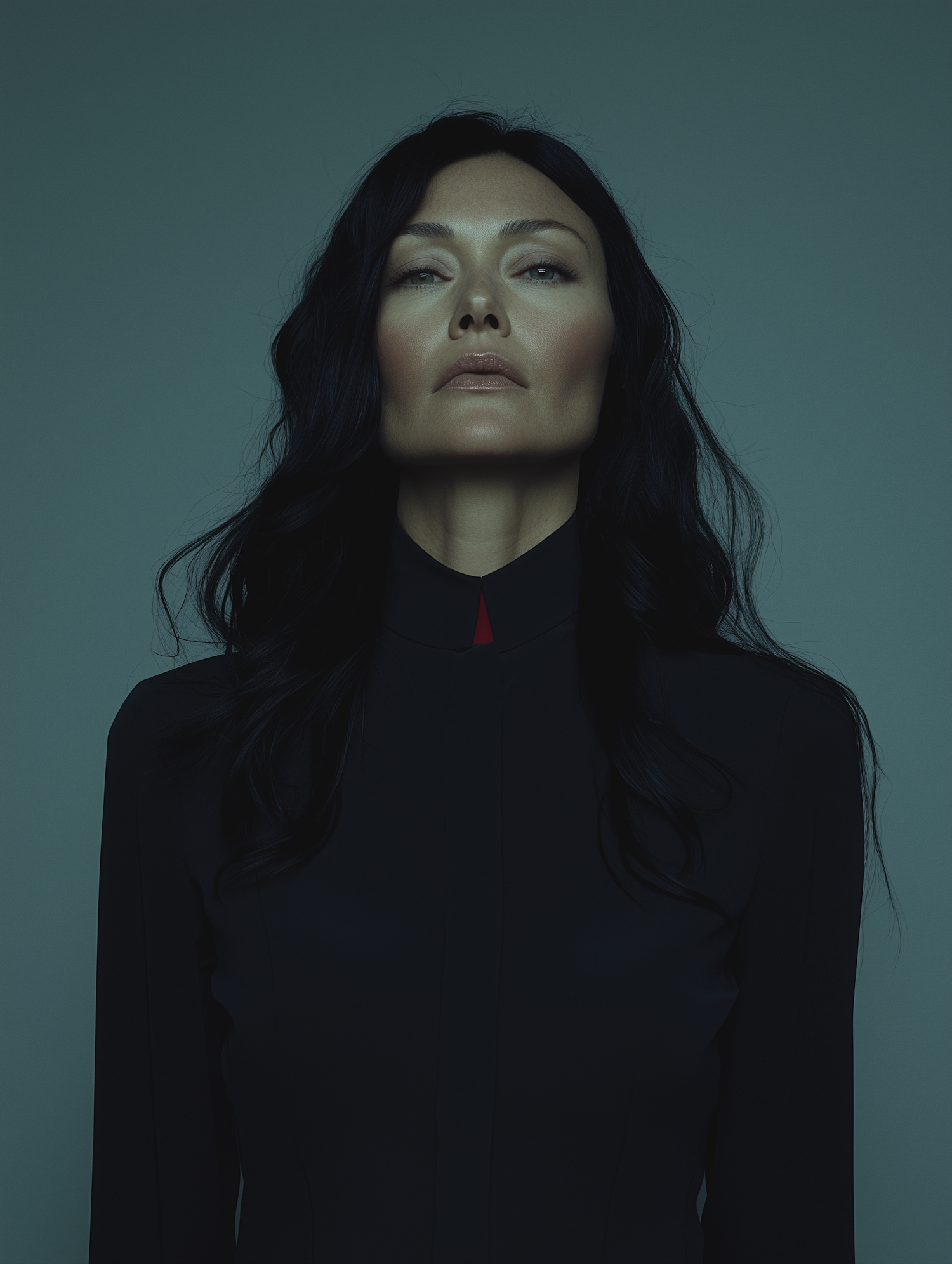 Portrait of a woman with long black hair and a serious expression, wearing a dark high-collared outfit with a red accent.