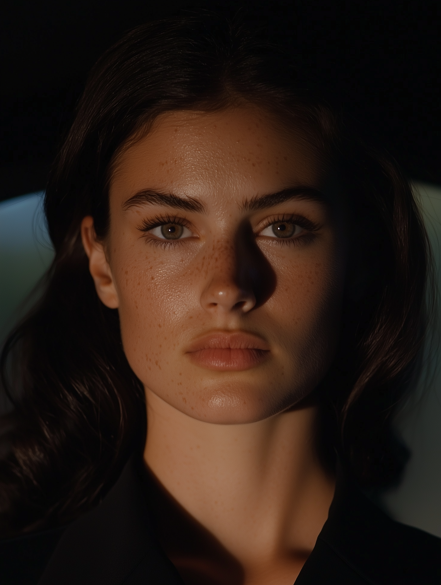 Portrait of a young woman with dark hair and hazel eyes, softly lit, highlighting her freckles and calm expression.