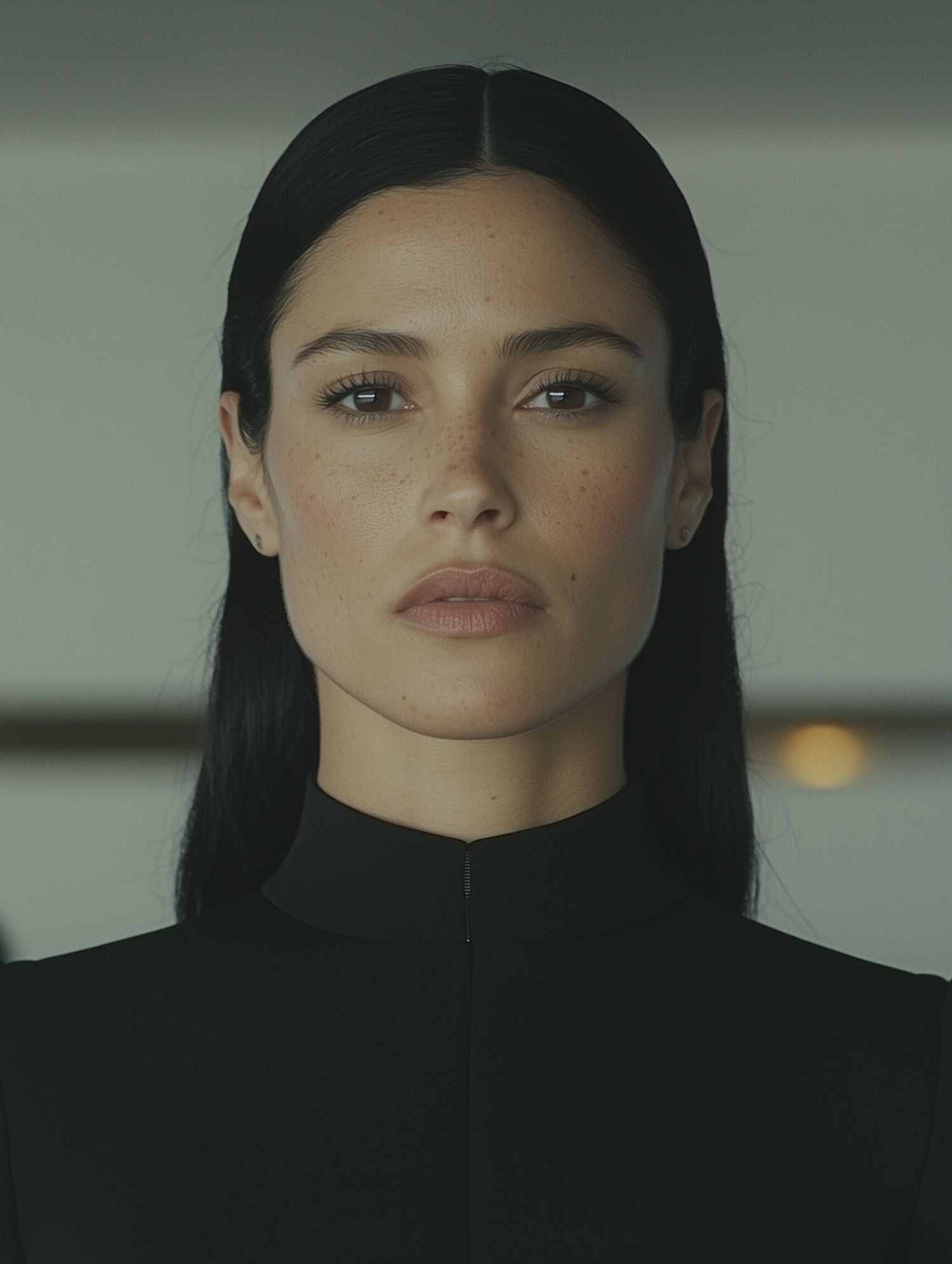 Elegant woman with long black hair and freckles, wearing a high-necked black top, exudes calm and confidence.