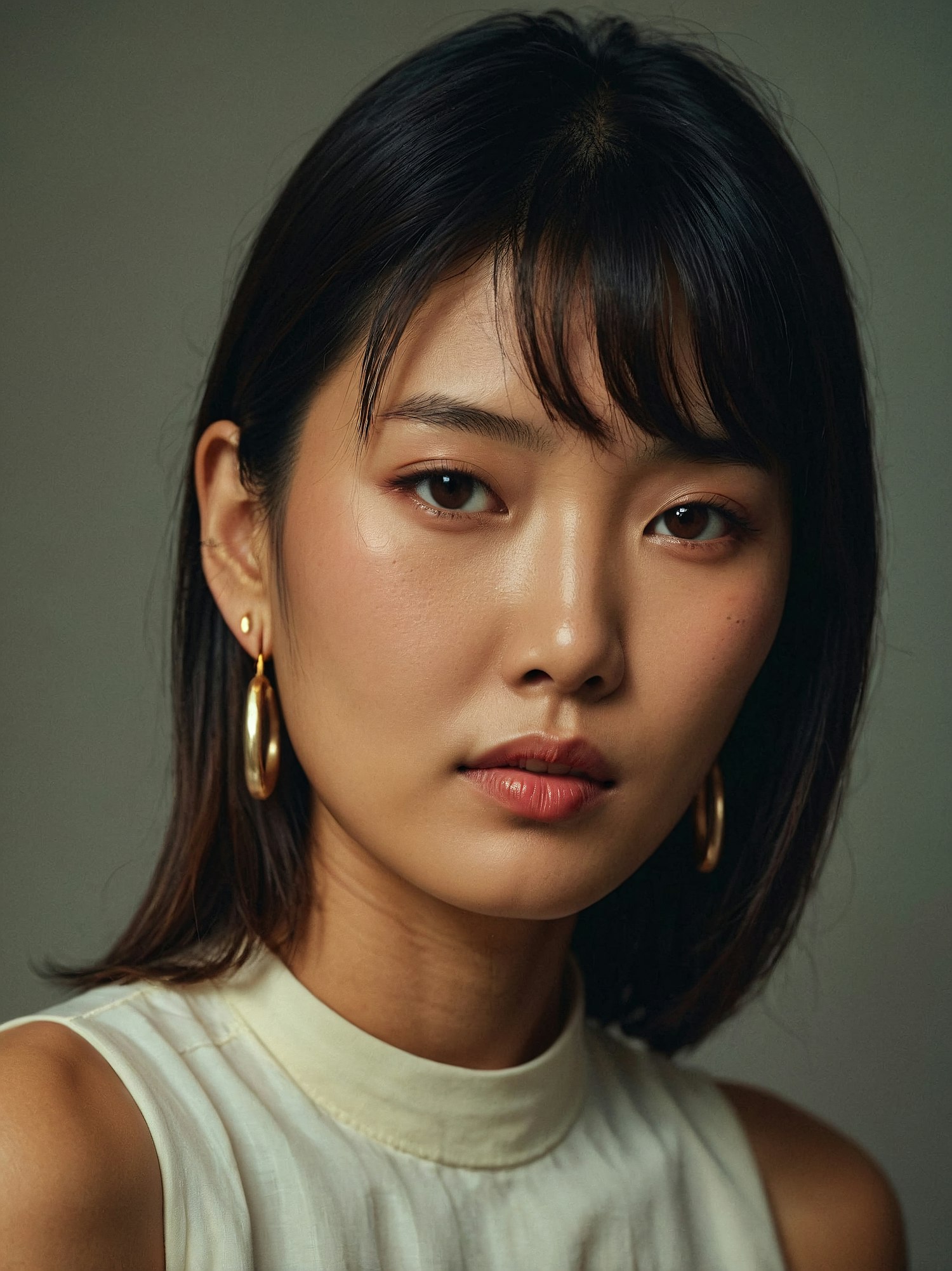 Portrait of an Asian woman with dark hair, gold hoop earrings, and a white top, exuding elegance and confidence.