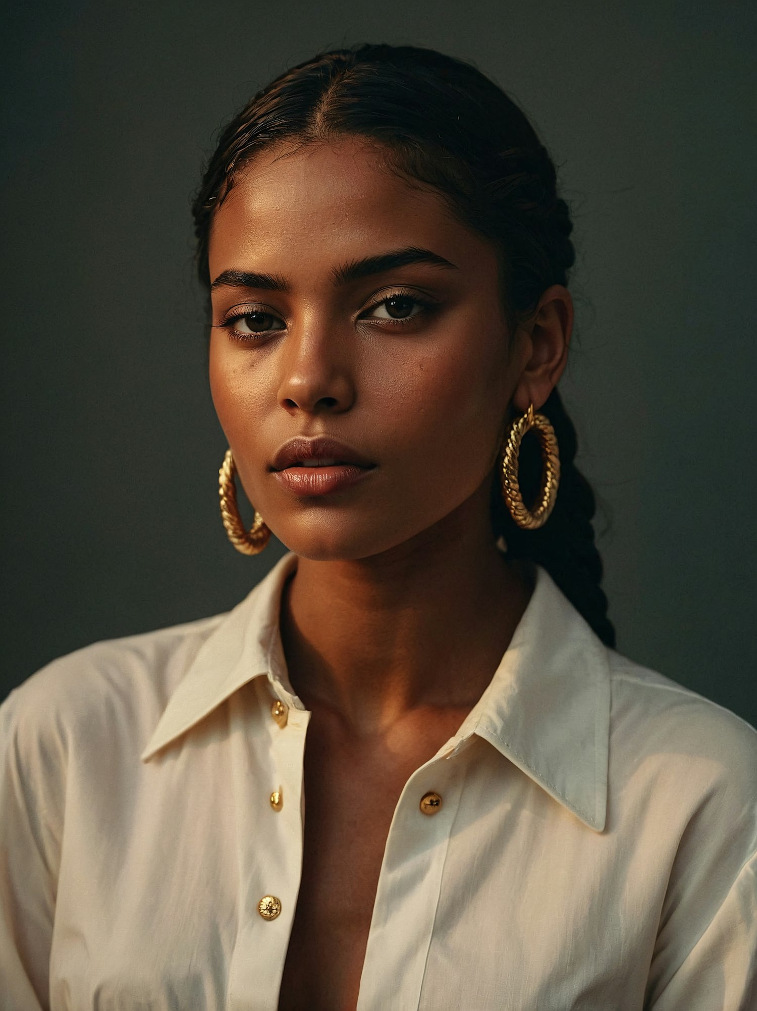Portrait of a woman with gold hoop earrings and a cream shirt, exuding elegance and confidence against a dark background.