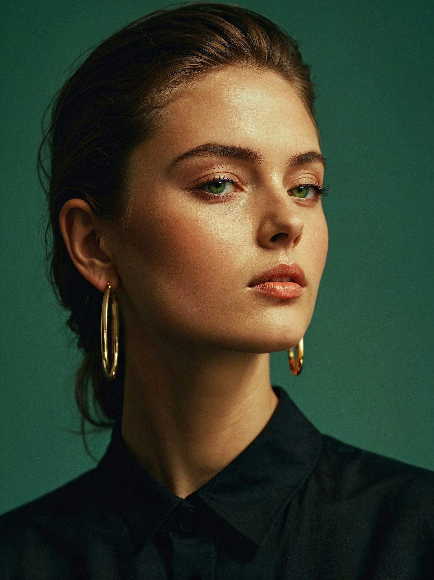 Elegant woman with green eyes, gold hoop earrings, and a black shirt against a green background, exuding confidence and style.