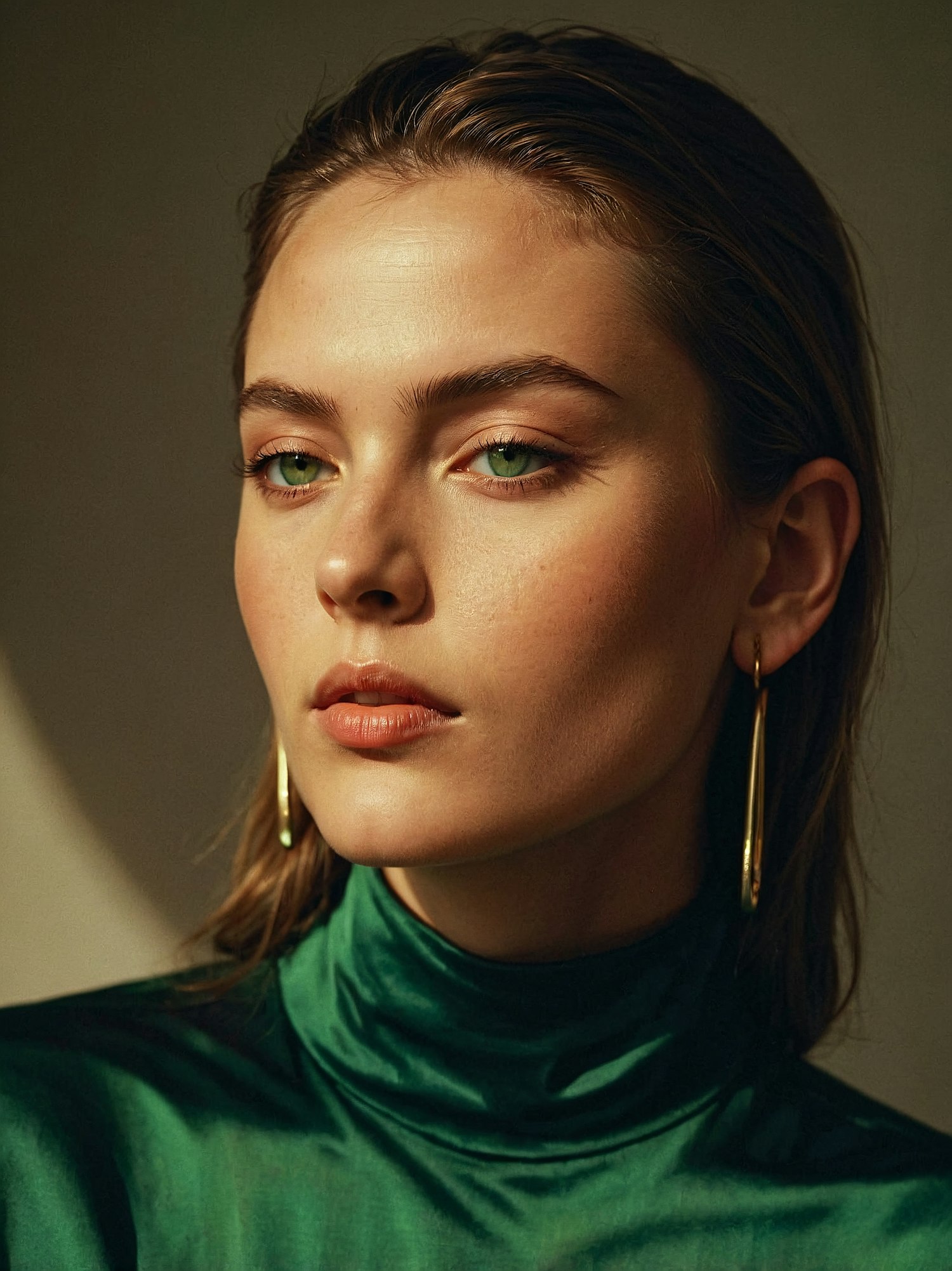 Portrait of a young woman with green eyes, slicked-back hair, and gold hoop earrings, wearing an emerald green satin top.