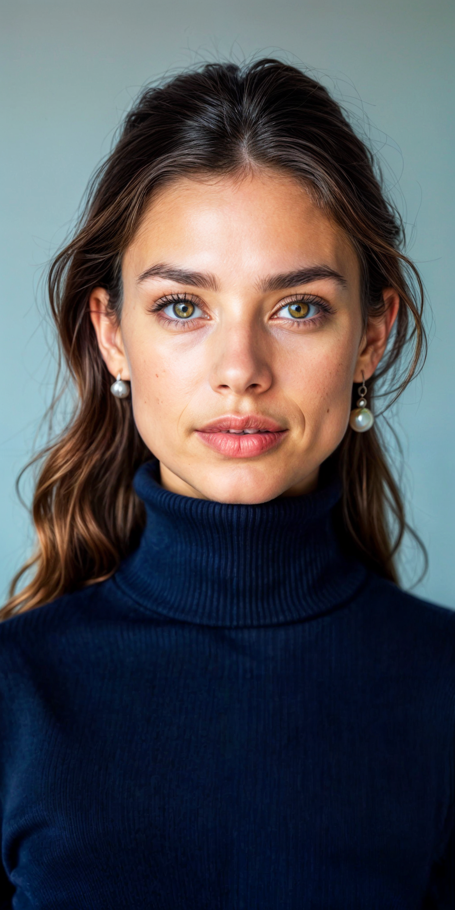 Portrait of a young woman with green eyes and brown hair, wearing a blue turtleneck and pearl earrings against a soft blue background.