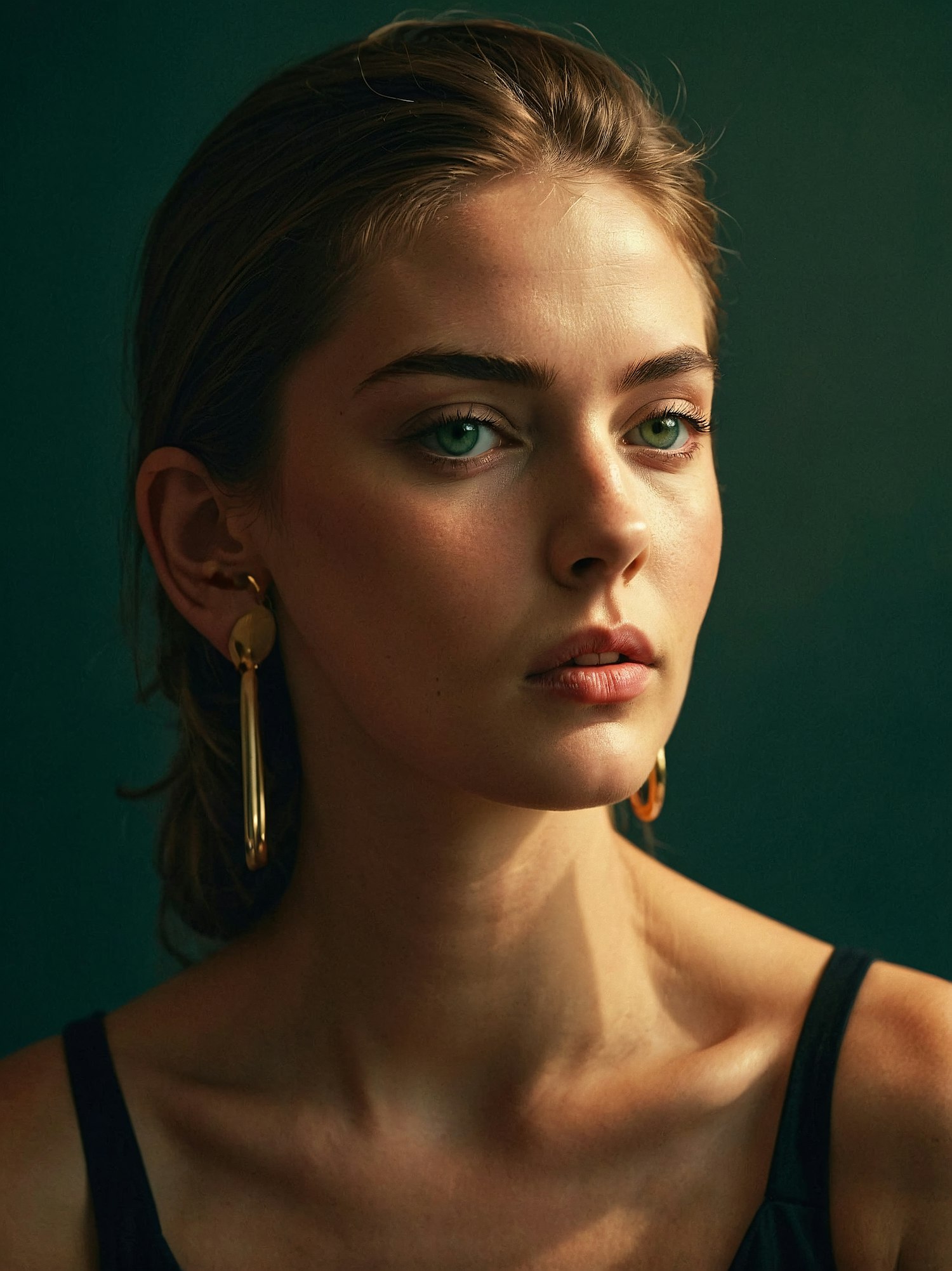 Portrait of a young woman with green eyes and gold earrings against a dark green background, exuding elegance and calmness.