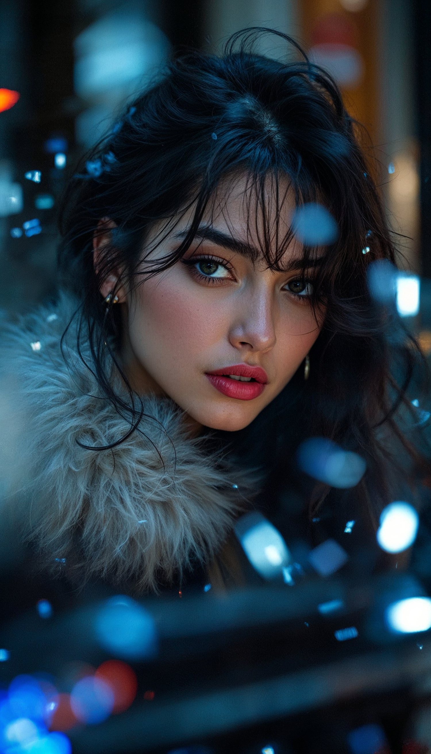 Portrait of a woman with blue eyes and dark hair in a fur coat, surrounded by bokeh lights, creating a dreamy atmosphere.