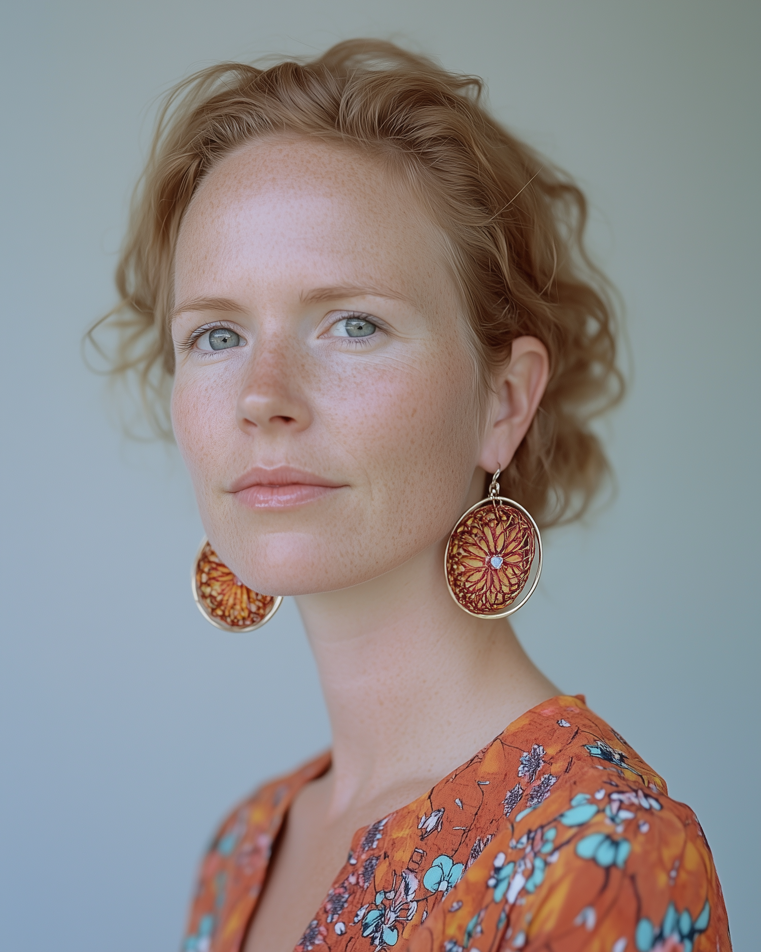 Caucasian woman with light brown hair, blue eyes, and large patterned earrings in a floral orange dress against a neutral background.