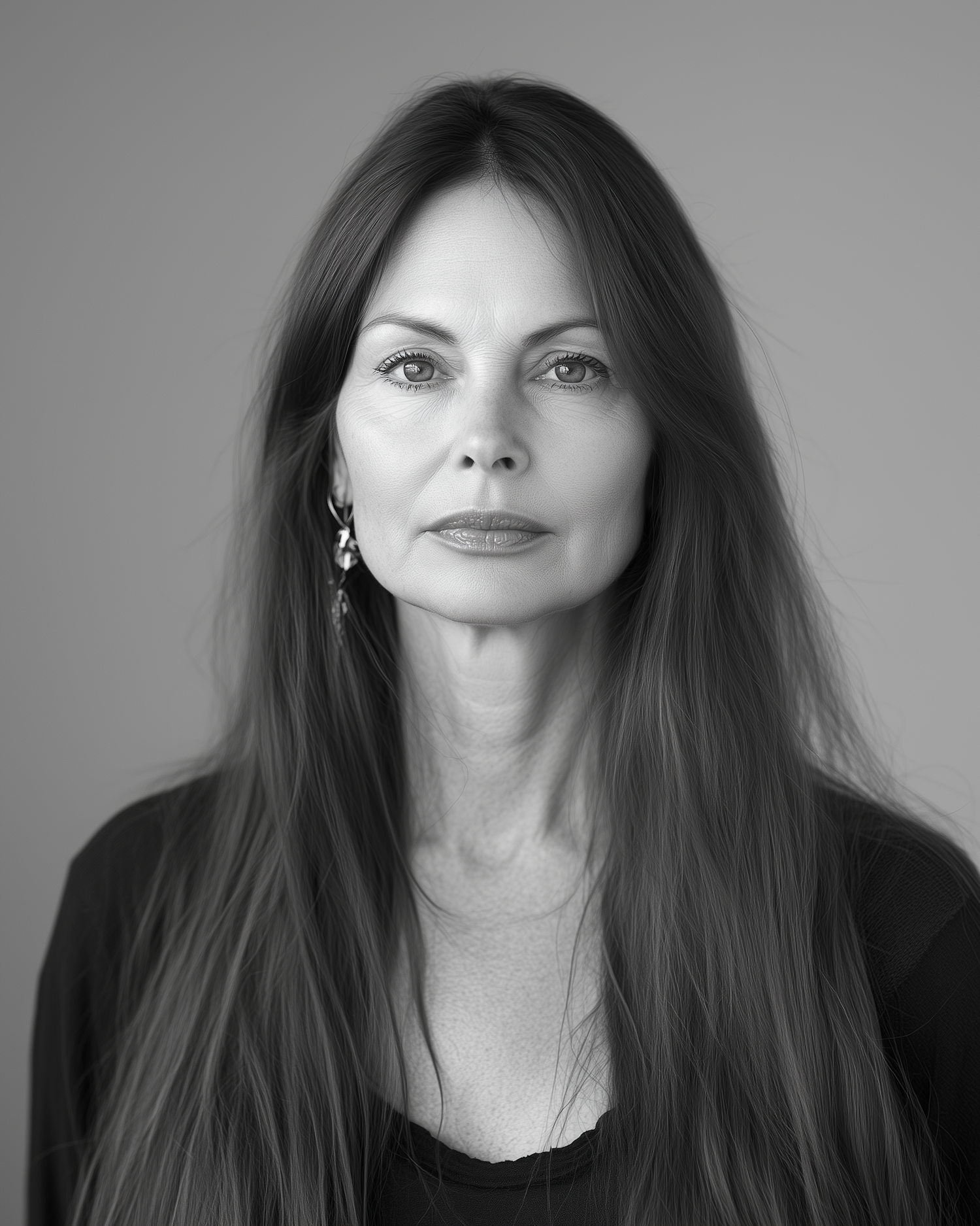 Black and white portrait of a woman with long hair, serene expression, and dangling earrings against a soft gray background.