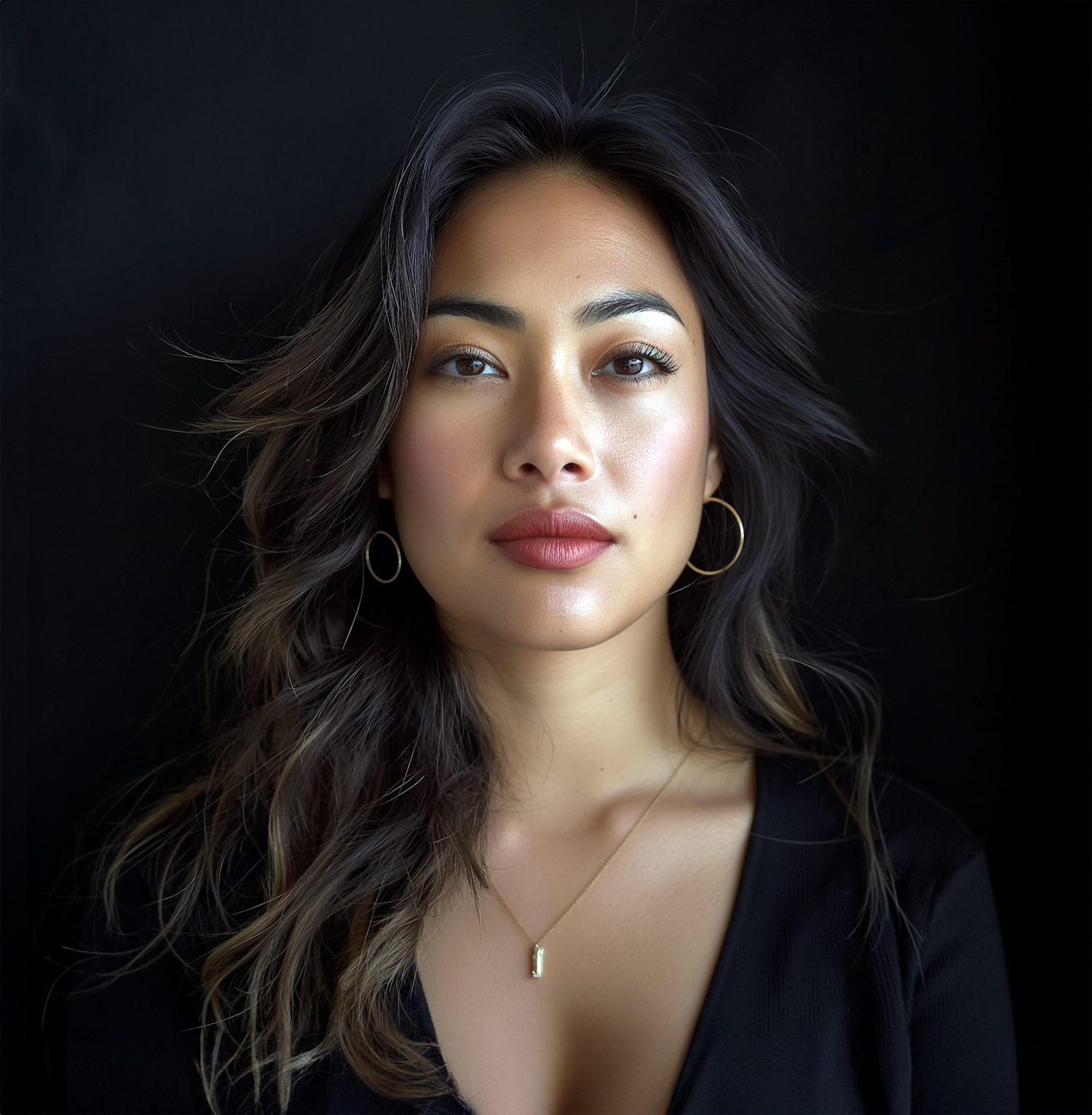 Portrait of a woman with wavy dark hair, hoop earrings, and a gold necklace against a black background.