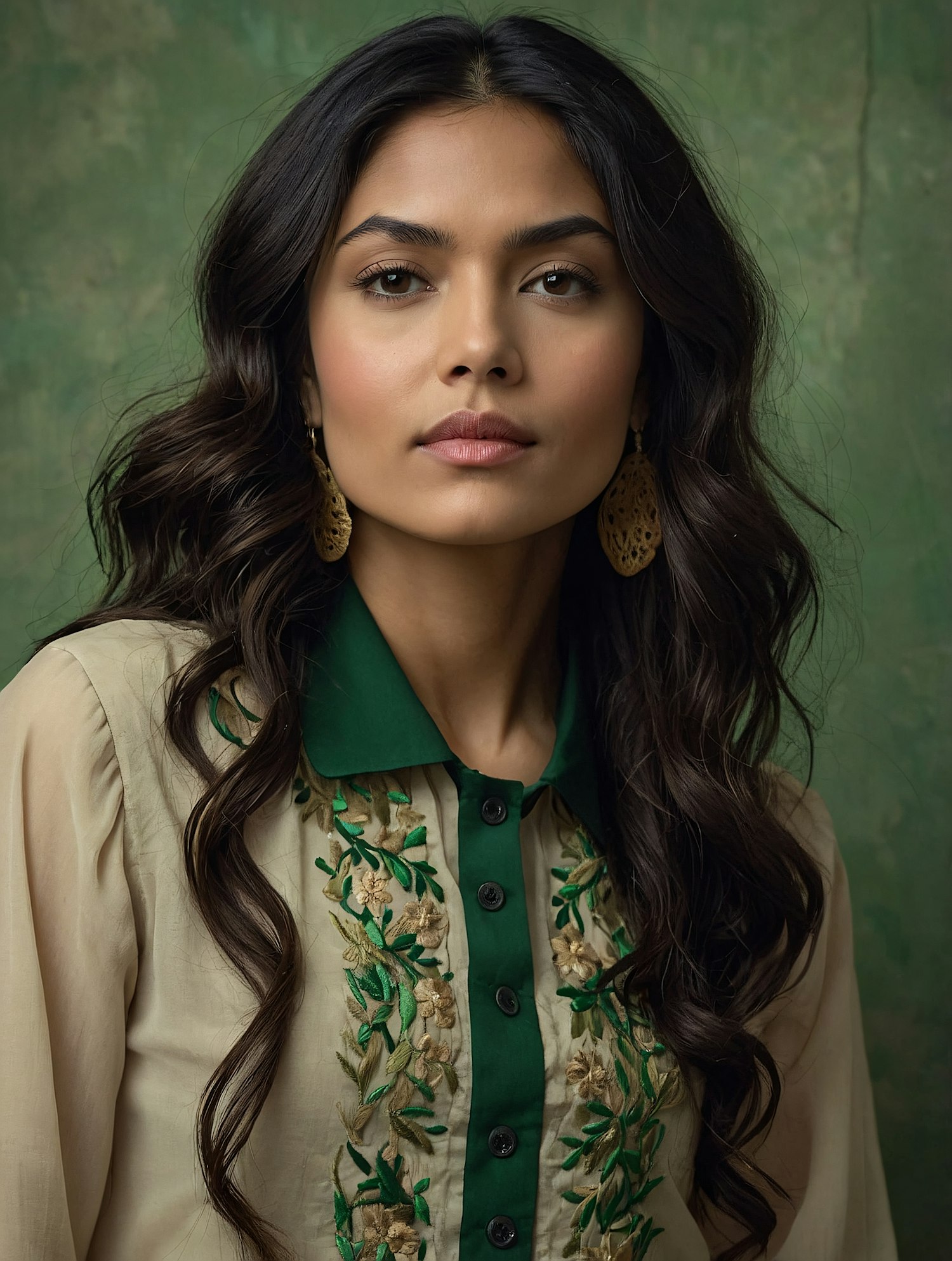 Elegant woman with wavy hair and floral embroidered blouse against a textured green background, exuding confidence and style.