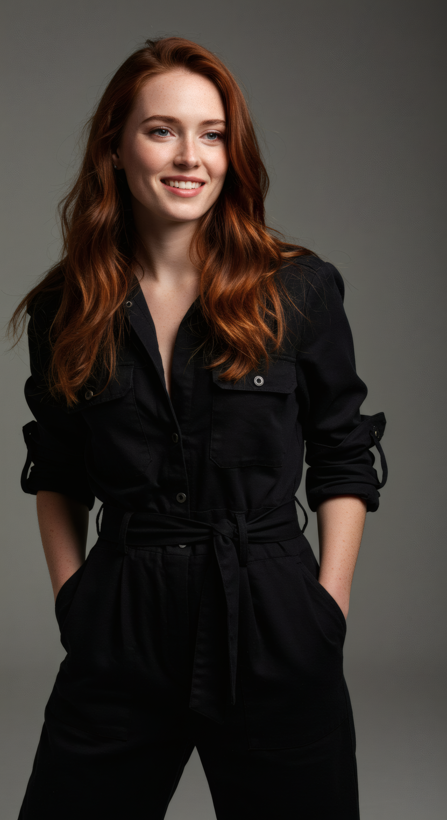 Confident woman with red hair in a black jumpsuit, smiling against a gray background.