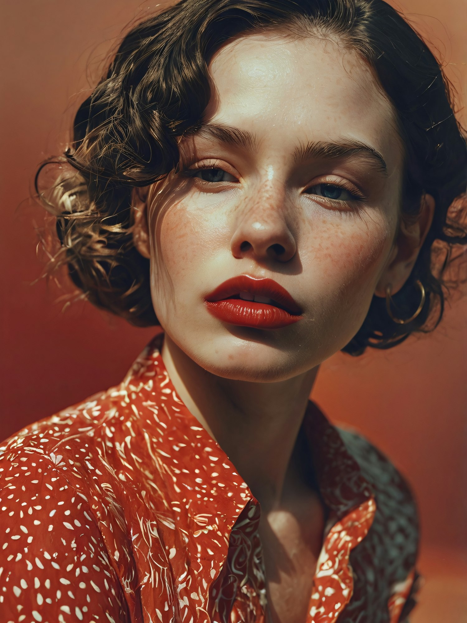 Portrait of a young woman with curly hair, red lipstick, and a patterned shirt against a warm orange background.