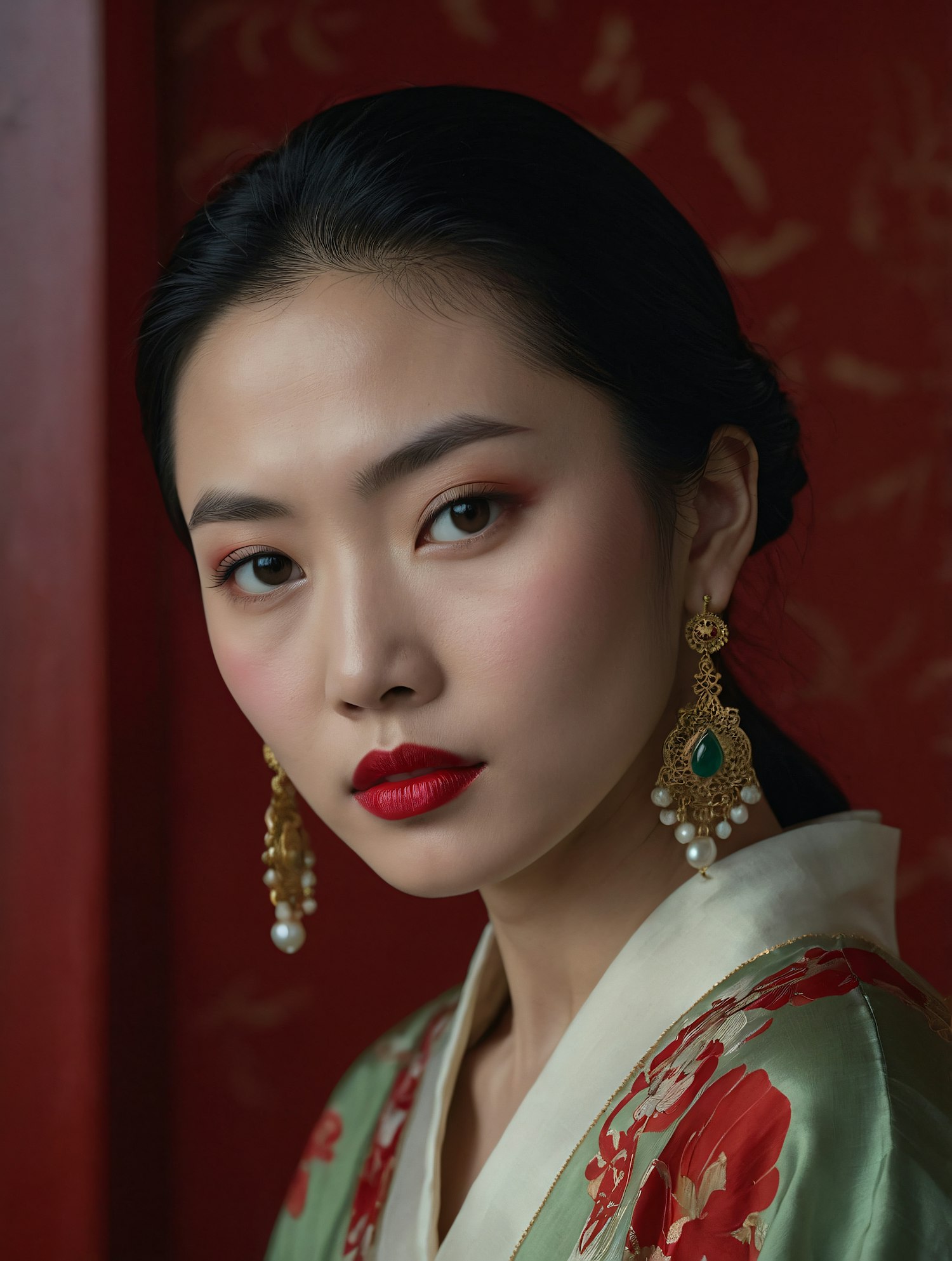 Elegant portrait of an Asian woman in traditional attire with gold earrings, red lipstick, and a floral pattern against a red background.