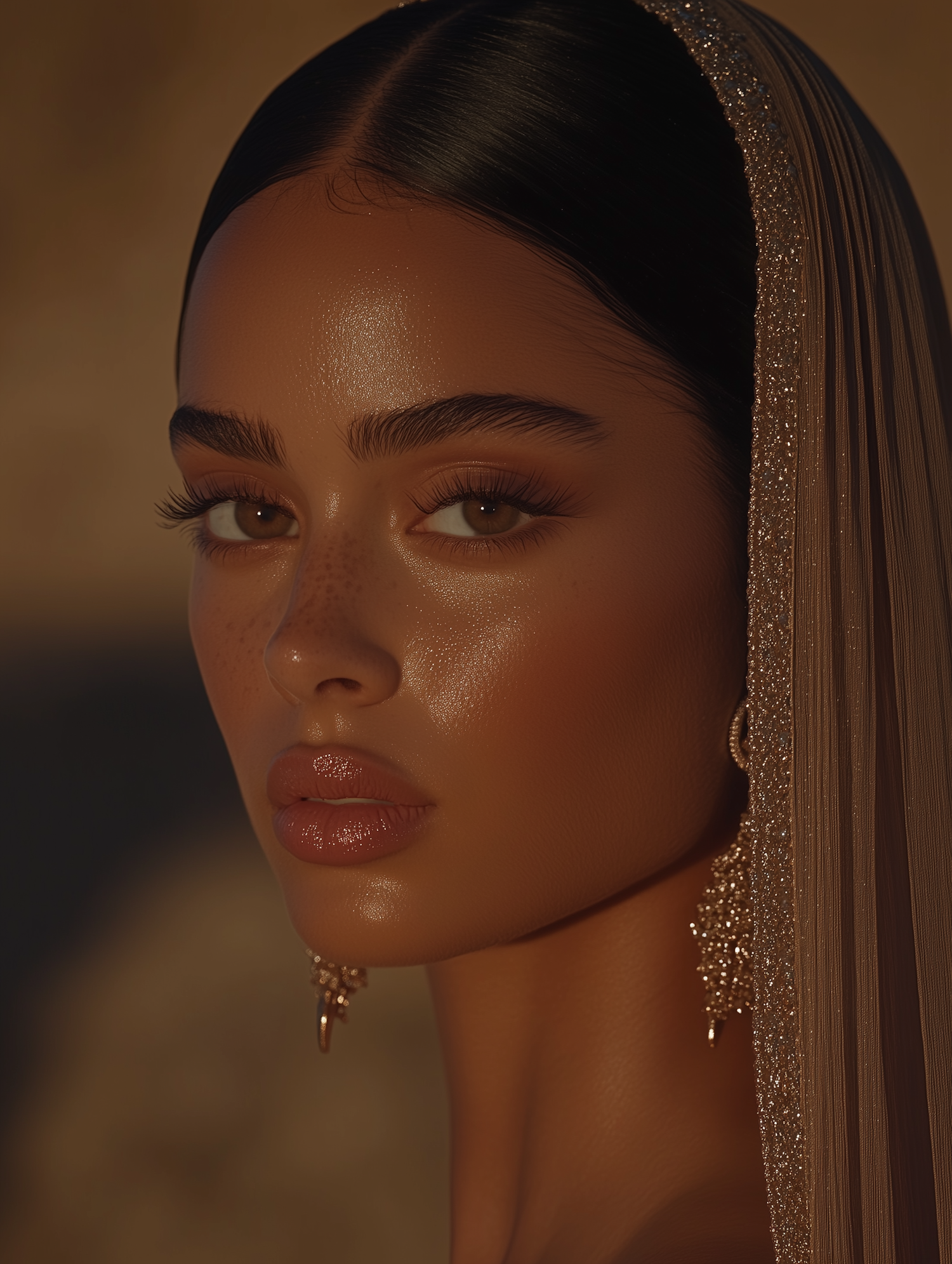 Close-up portrait of a woman with glowing skin, dark hair, and elegant headscarf, exuding beauty and confidence in warm lighting.