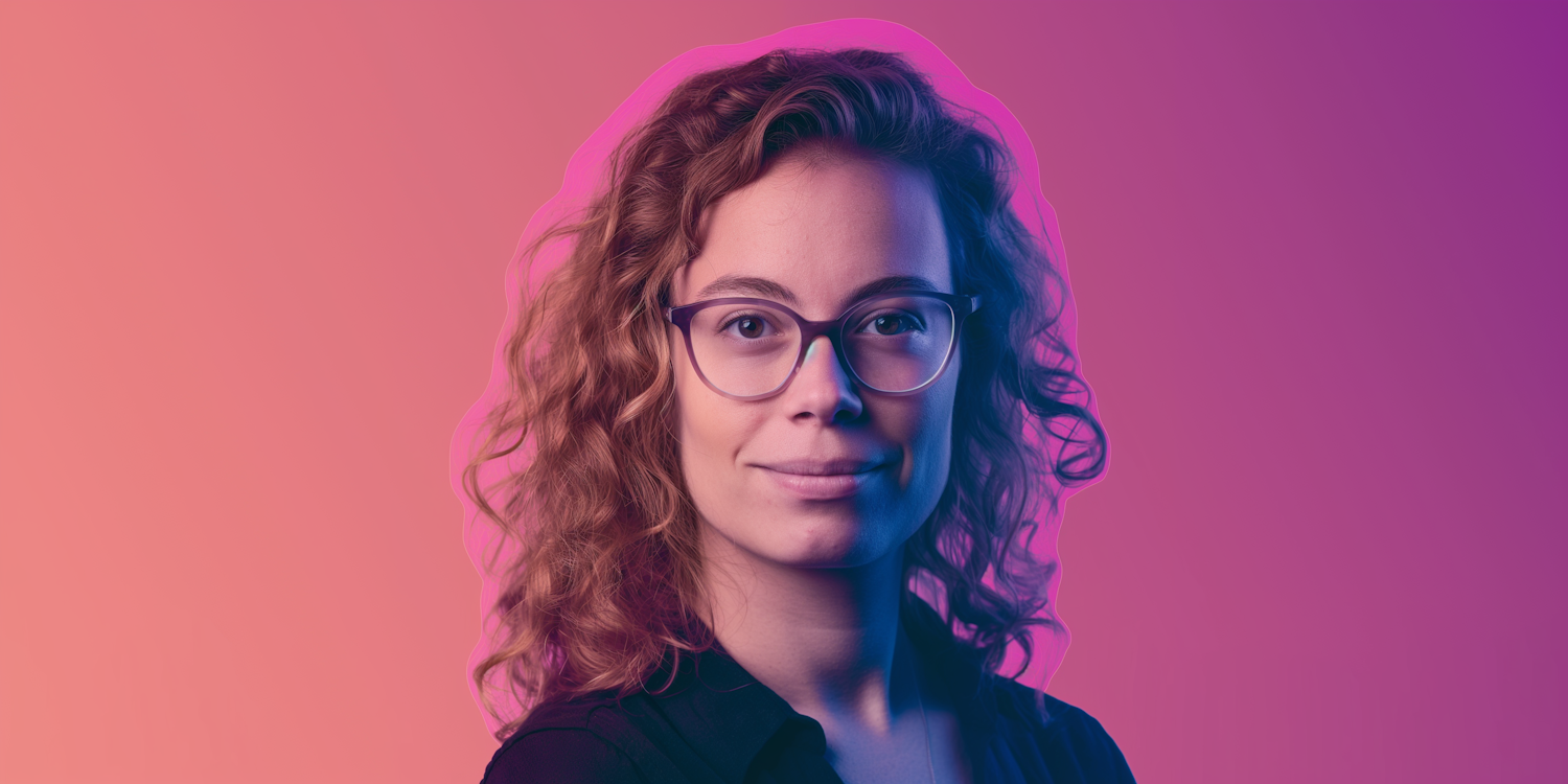 Portrait of a young woman with curly hair and glasses against a vibrant pink-purple gradient background.
