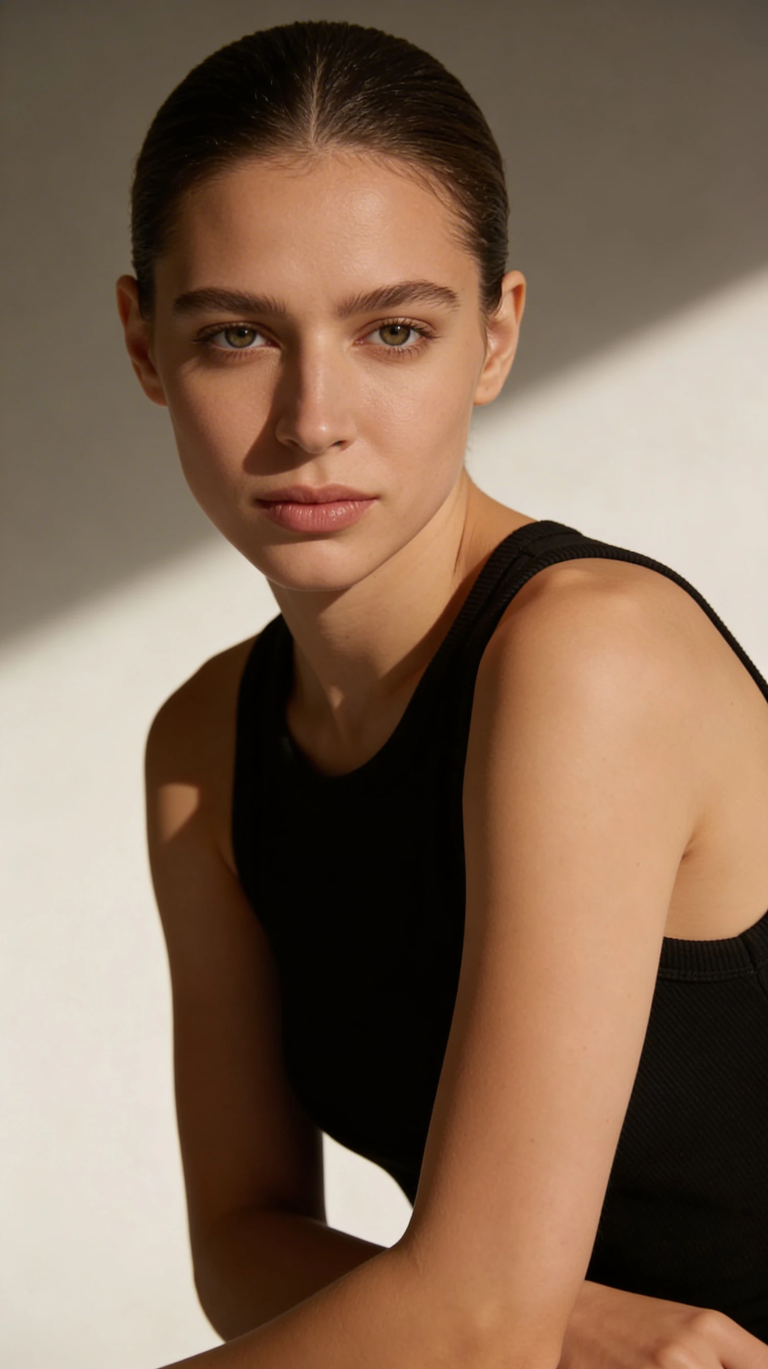Portrait of a young woman with light brown hair and fair skin, wearing a black top, captured in soft lighting with a neutral background.