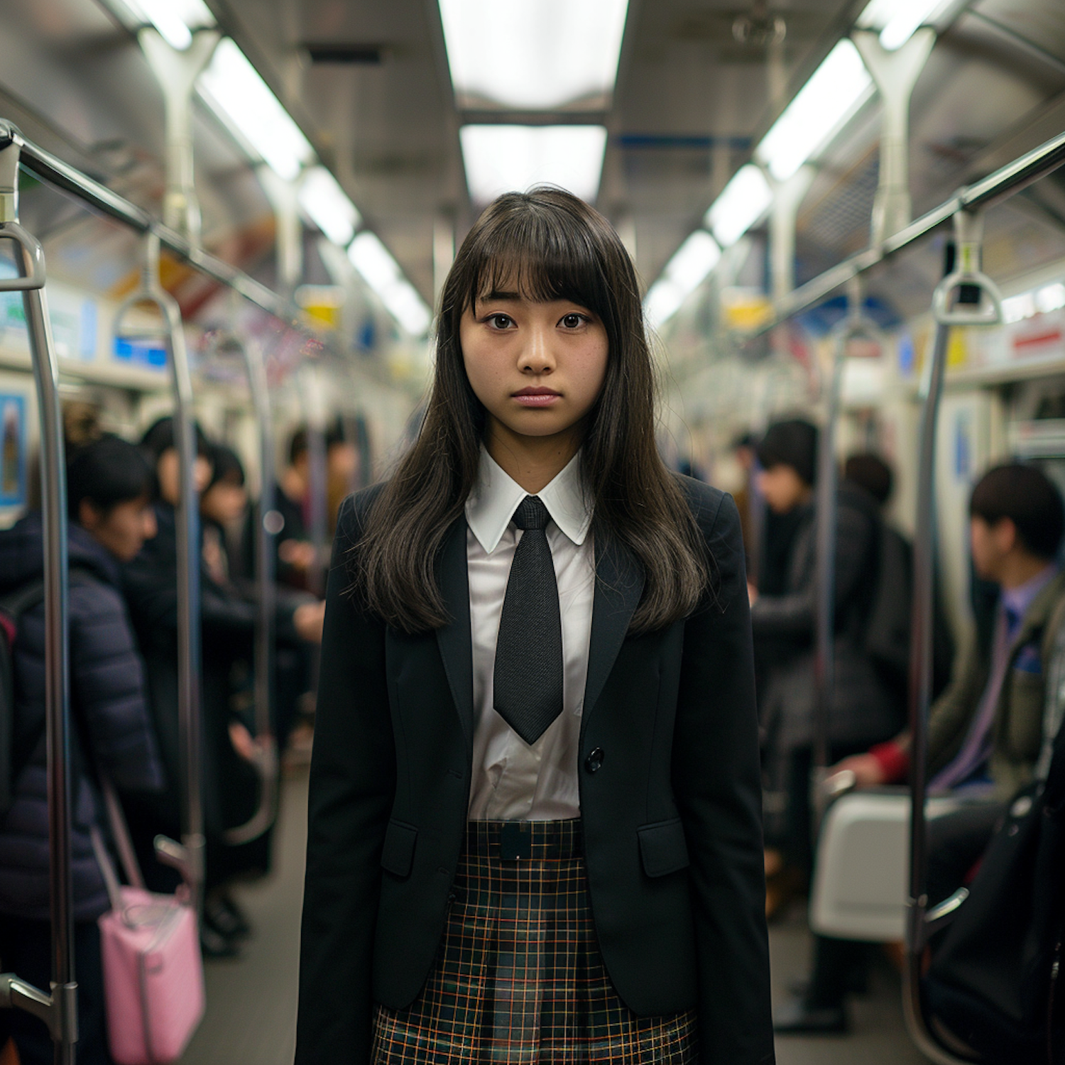 Asian girl in school uniform stands in a subway train, surrounded by passengers. She gazes directly at the camera, creating a striking focal point.