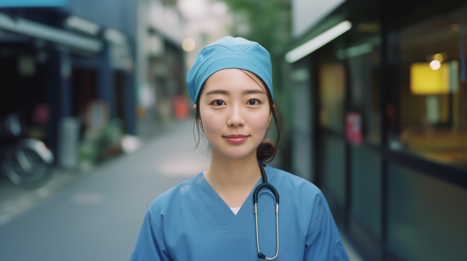 Asian female medical professional in blue scrubs with stethoscope, standing confidently in an urban setting.
